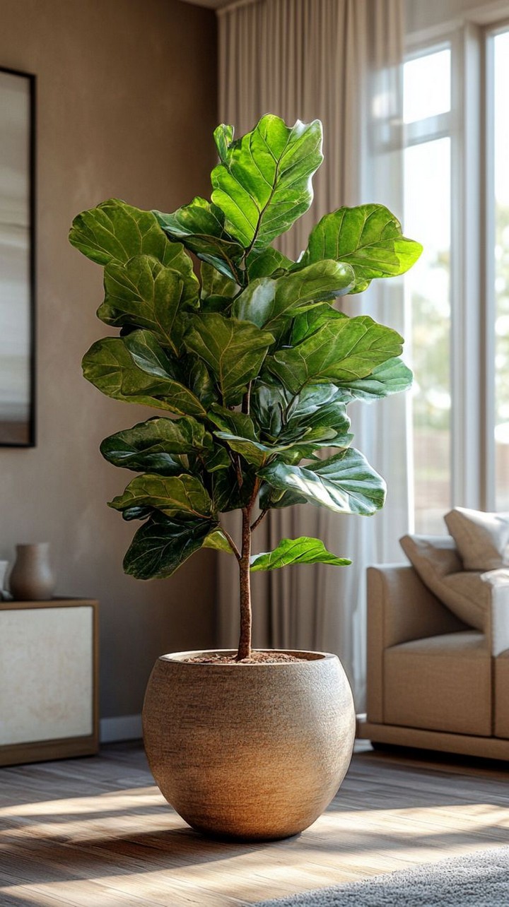 Add drama with large indoor plants like fiddle leaf figs, olive trees, or bird of paradise plants in stylish planters.