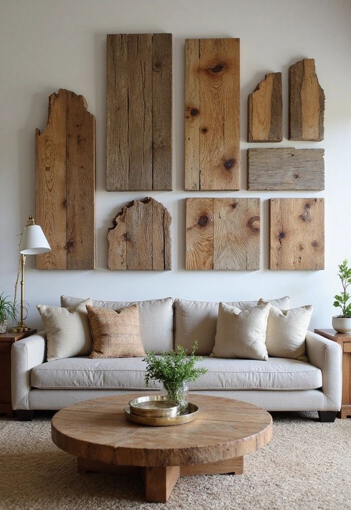 Incorporate raw wood elements through floating shelves, picture frames, or decorative bowls to add organic warmth.