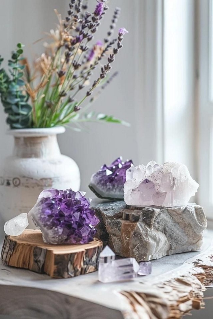 Display collections of interesting stones, crystals, or minerals on shelves or coffee tables for natural texture.
