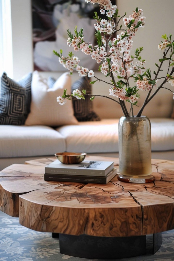 Bring natural elements into your modern space with live-edge wood coffee tables. The organic shapes contrast beautifully with geometric furniture pieces.