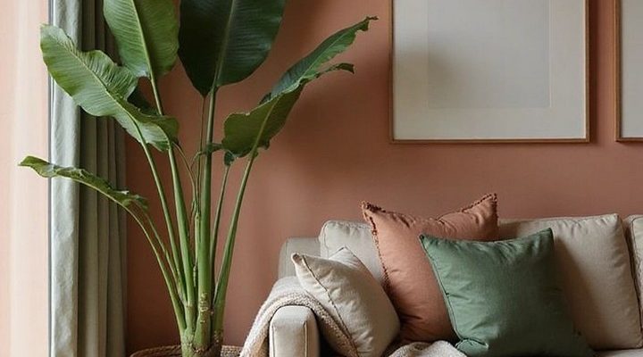 Use burnt sienna as an accent color through artwork, throw pillows, or a single accent wall. This deep, warm brown-red adds richness without overwhelming the space. Pair with sage green plants and natural wood furniture.