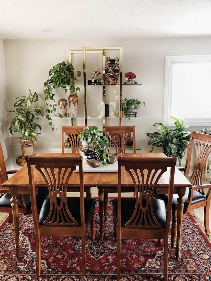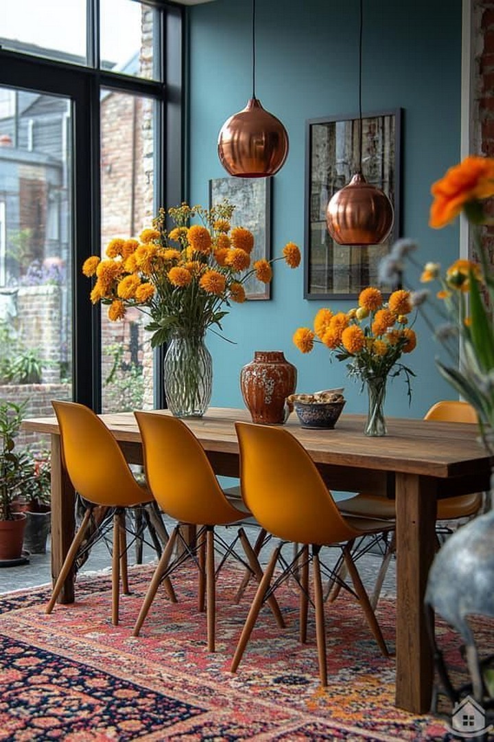 Create a cozy dining space with mixed seating, layered textiles, hanging plants, and a combination of vintage and modern lighting fixtures.