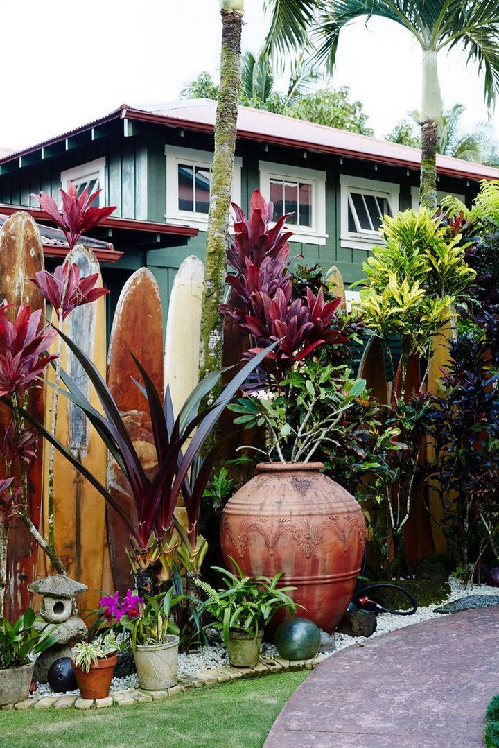 Create a resort-like atmosphere by mixing modern poolside furniture with vintage accessories and tropical plants.