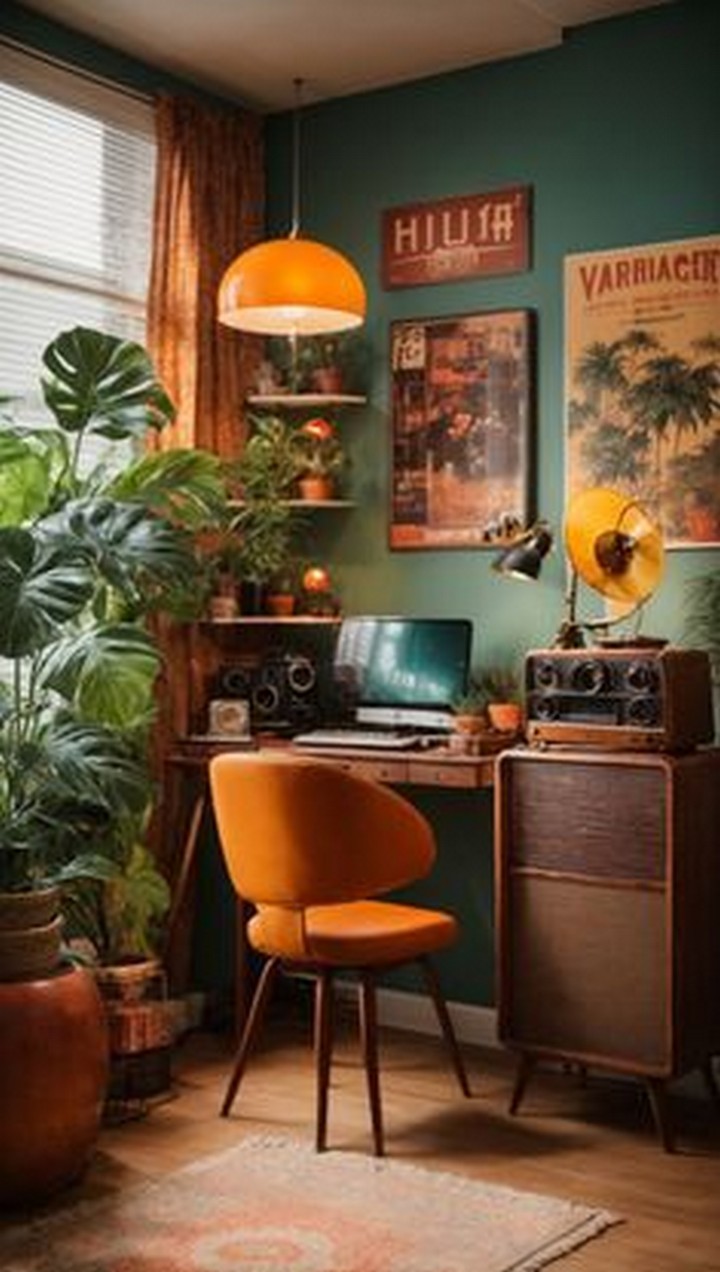 Create a space dedicated to music by mixing vintage instruments with modern sound equipment and comfortable seating.