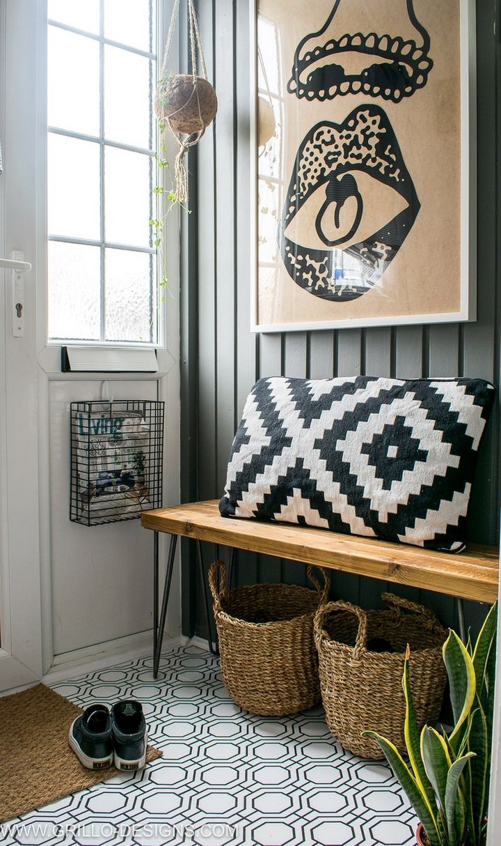 Transform a utilitarian space into a stylish entryway by combining modern storage solutions with vintage hooks and seating.