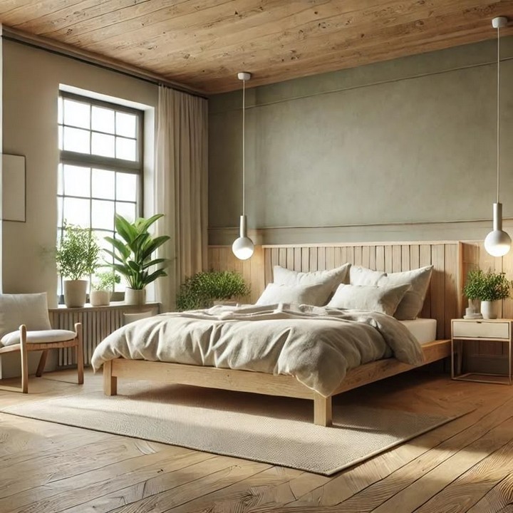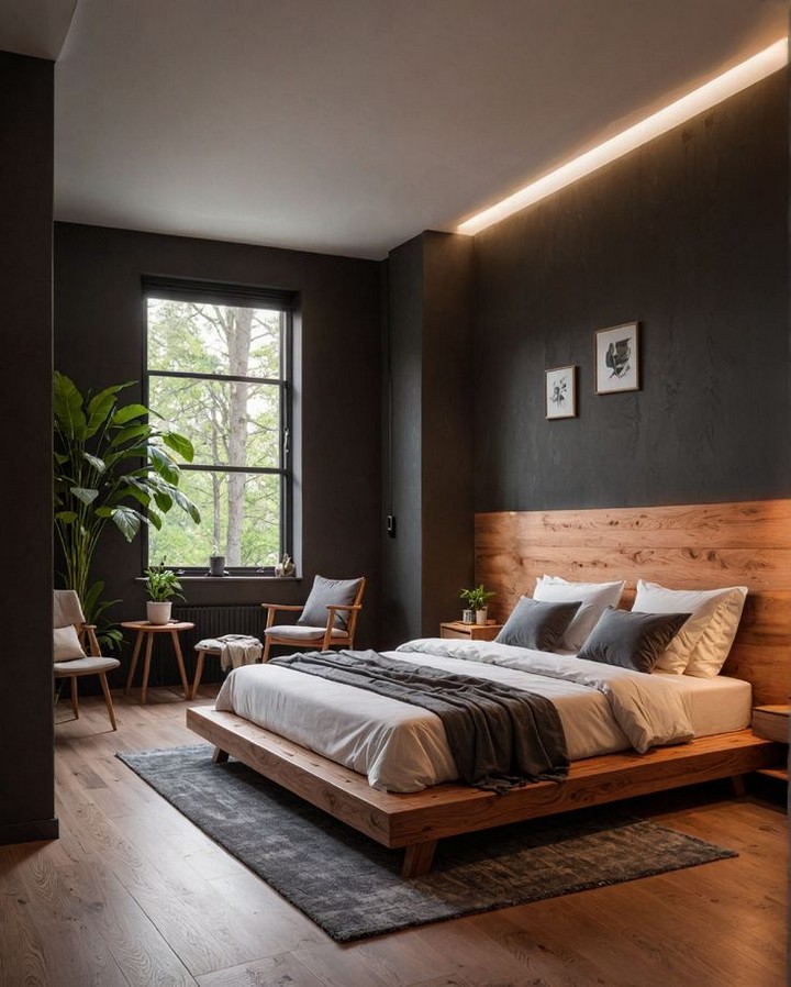 Opt for a simple wooden bed frame in oak, walnut, or ash. The natural grain adds organic texture while maintaining clean lines. Platform beds with integrated storage drawers offer functionality without compromising aesthetics.