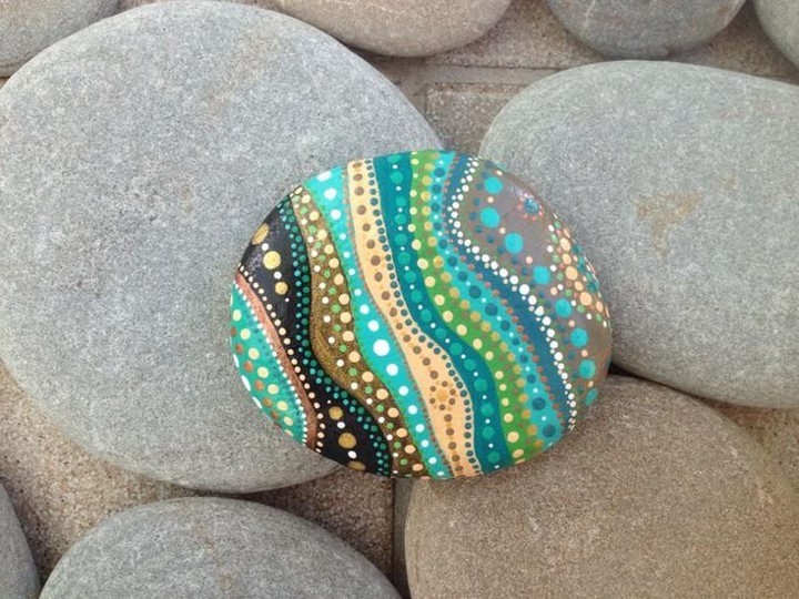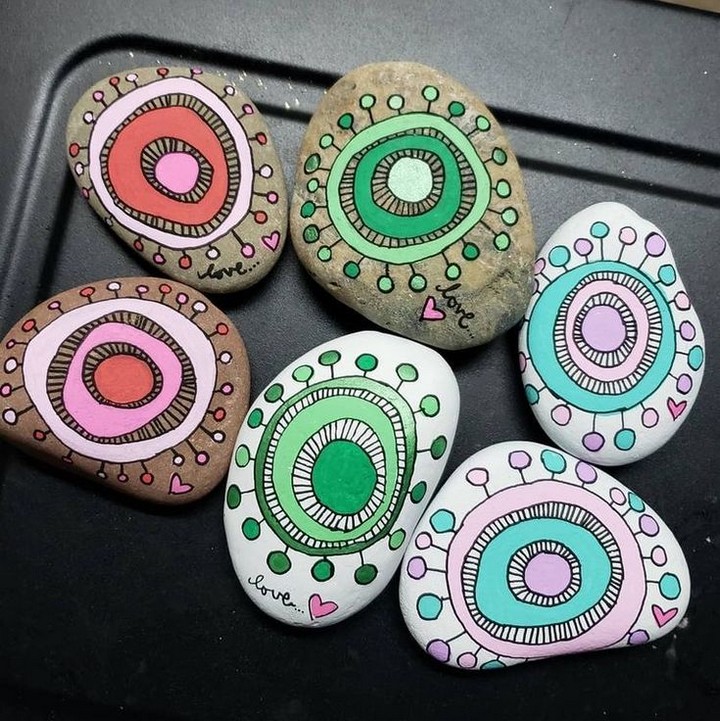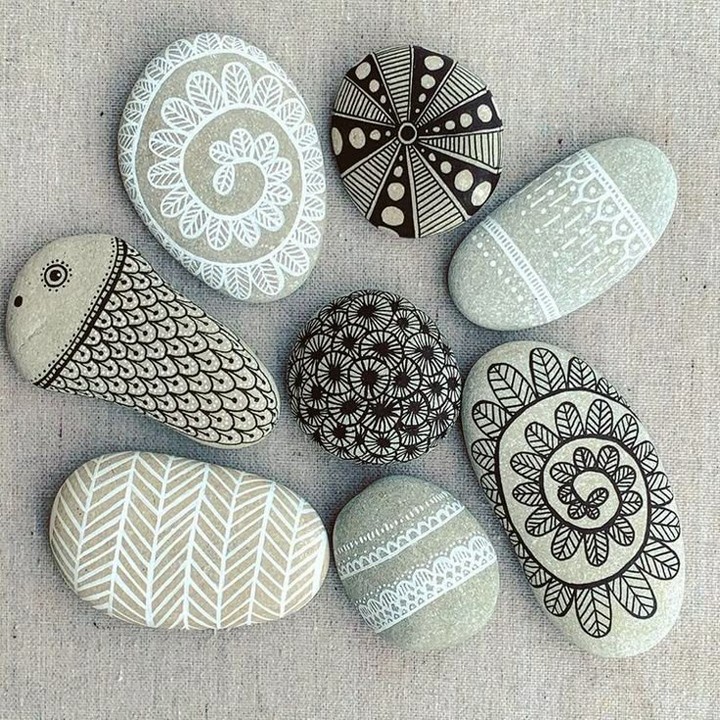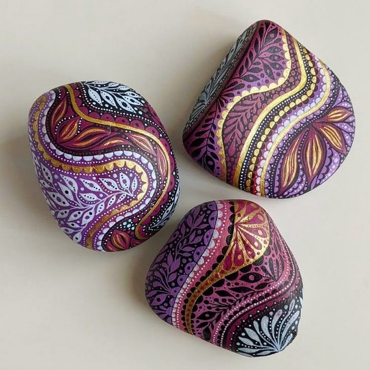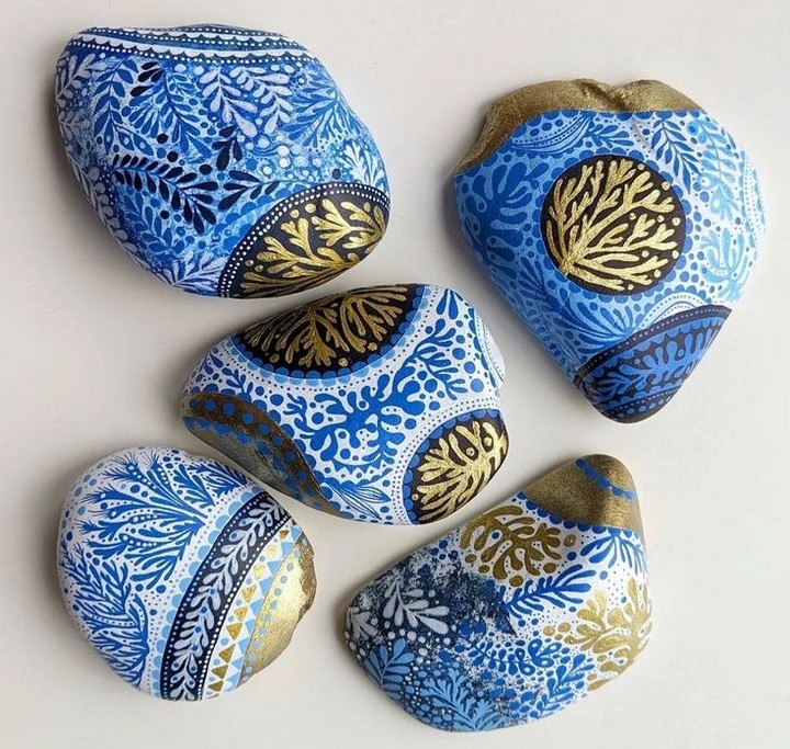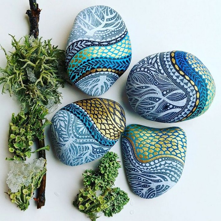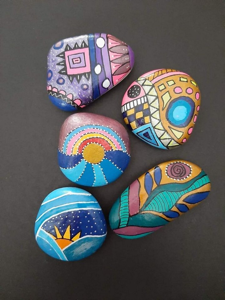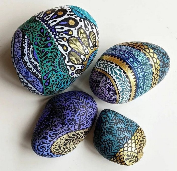 Design complementary patterns across multiple rocks that form a complete mandala when placed together. Plan the overall design carefully, ensuring each rock works independently while contributing to the larger composition. Perfect for creating large-scale installations or interactive puzzle-like art pieces.