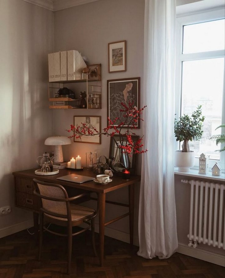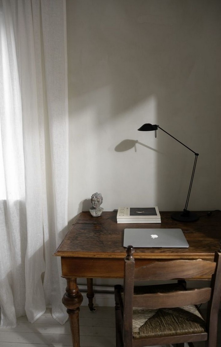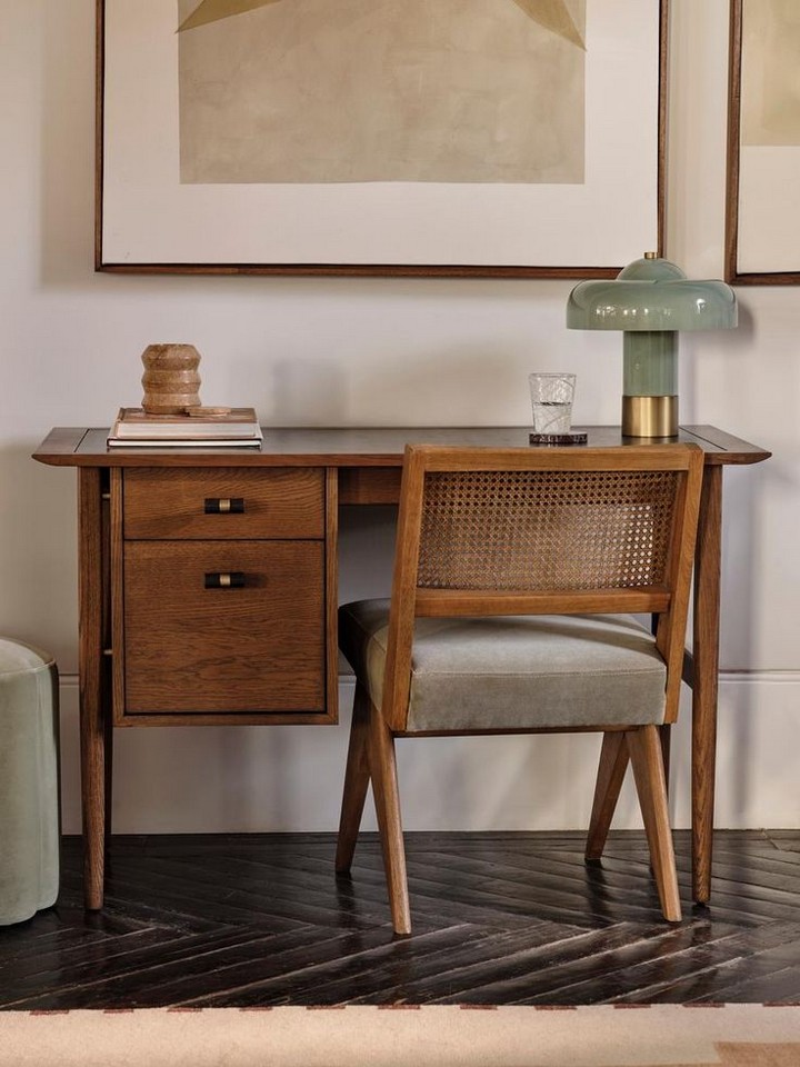 Choose a substantial wooden desk with original hardware and finish. These pieces provide inspiring workspace while adding character and craftsmanship that enhance productivity and creativity.