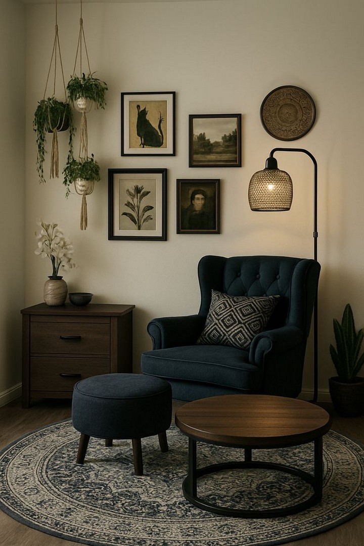 Add a plush velvet armchair in jewel tones with carved wooden legs. These statement pieces provide comfortable seating while introducing luxurious textures and rich colors that enhance room sophistication.