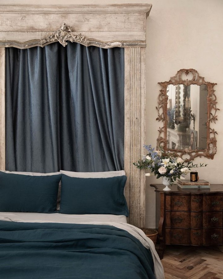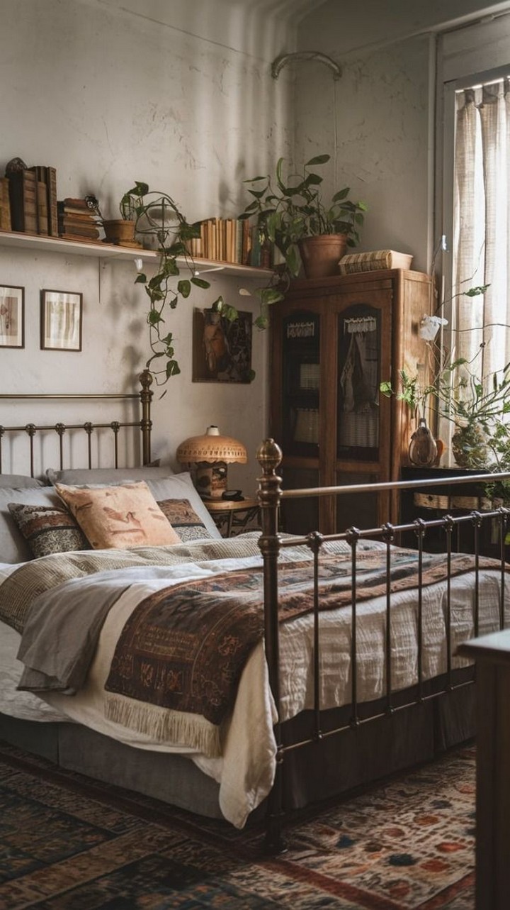 Choose an ornate wrought iron bed frame with intricate scrollwork and vintage patina. These pieces create romantic focal points while providing sturdy, timeless sleeping solutions.