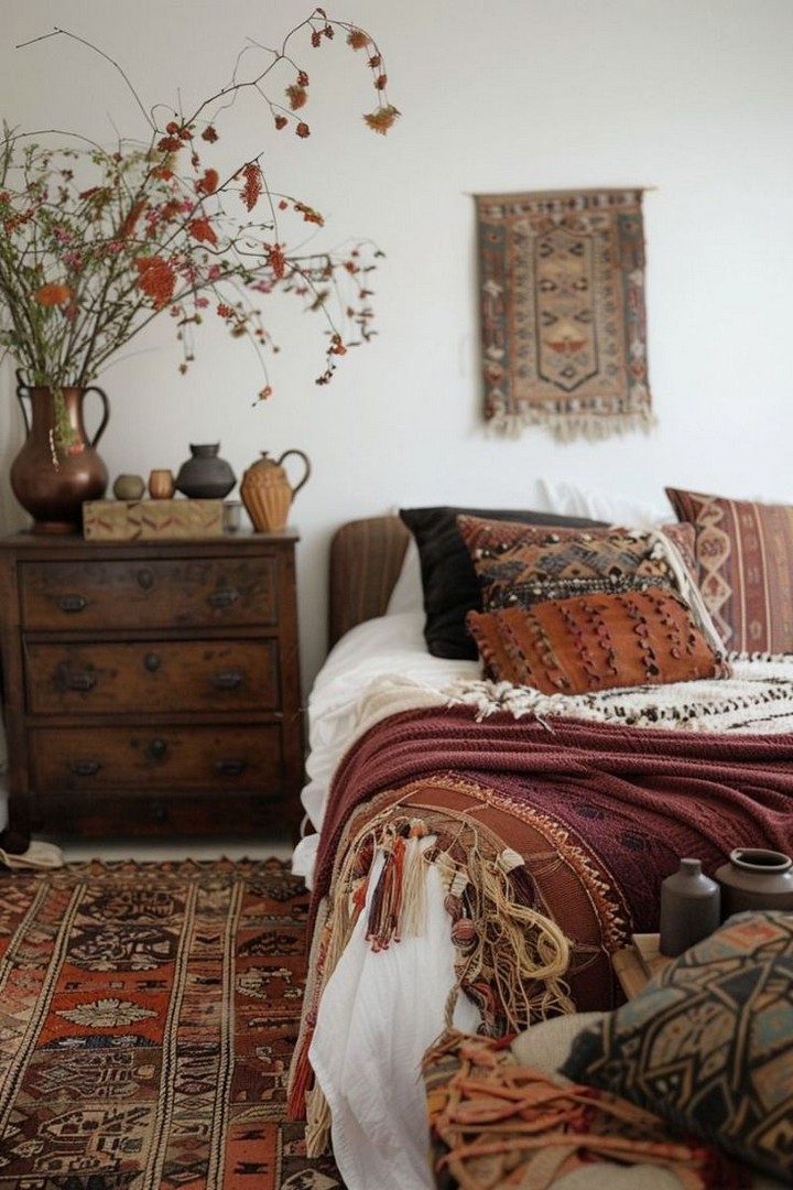 Select mismatched vintage nightstands that add character through their individual histories. These pieces provide bedside storage while creating interesting visual contrast and personal expression.