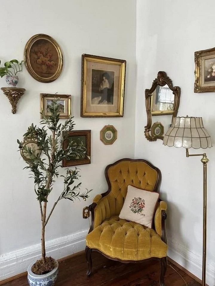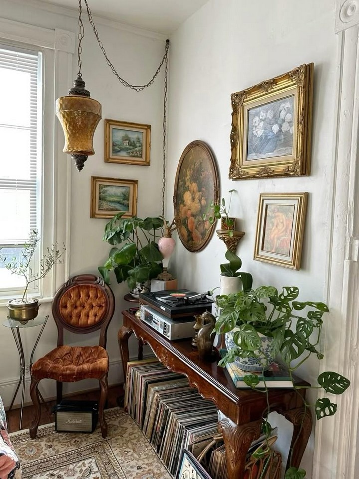 Install a vintage chandelier with crystal drops, brass details, or wrought iron construction. These pieces provide dramatic lighting while serving as artistic focal points.