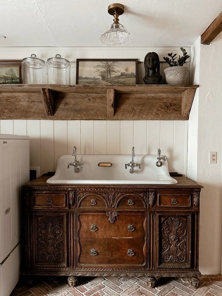 Include a vintage sideboard for serving and storage needs. These pieces provide practical functionality while adding substantial architectural presence and display surfaces.