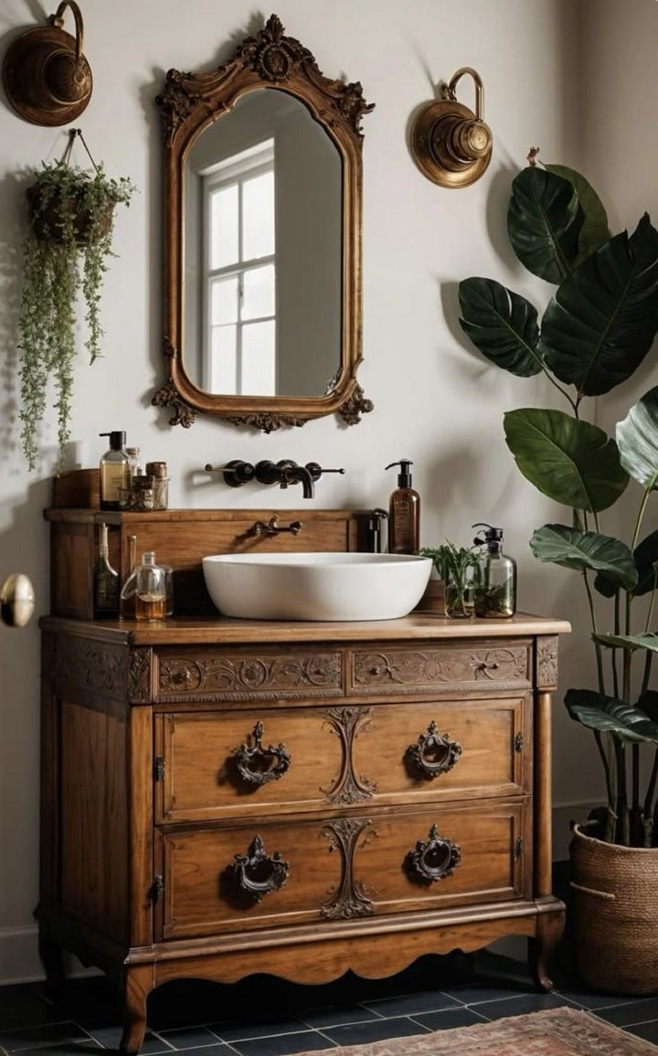Select an antique medicine cabinet with original mirror and shelving. These pieces provide practical storage while adding authentic period details that enhance bathroom character.
