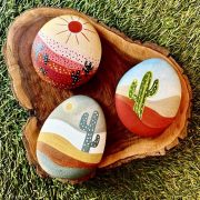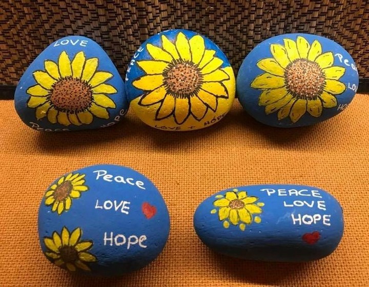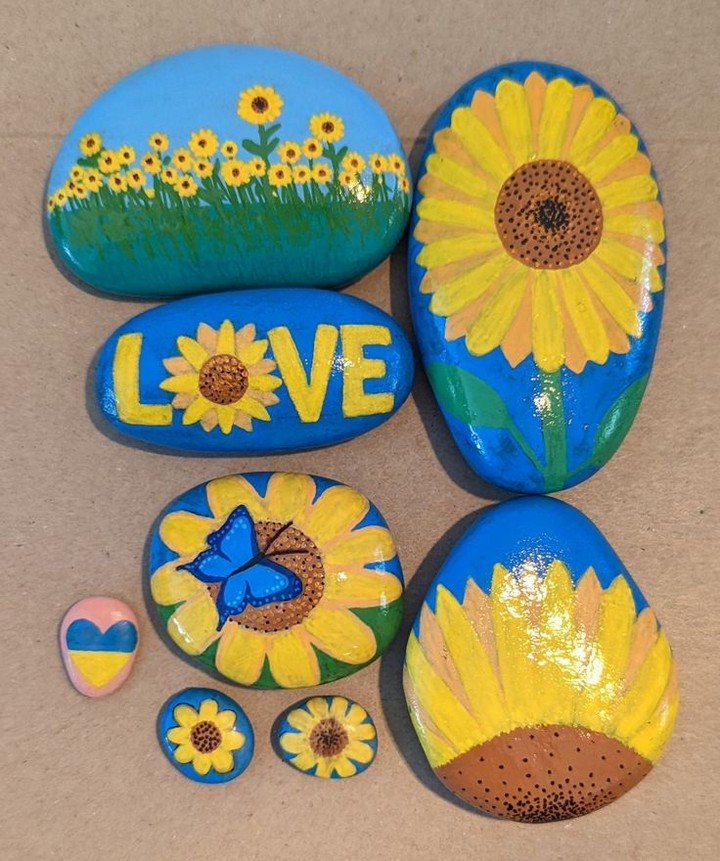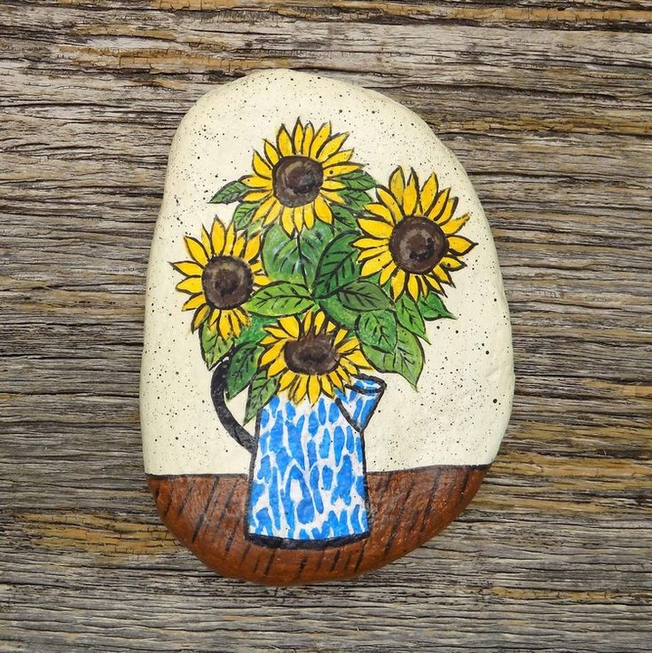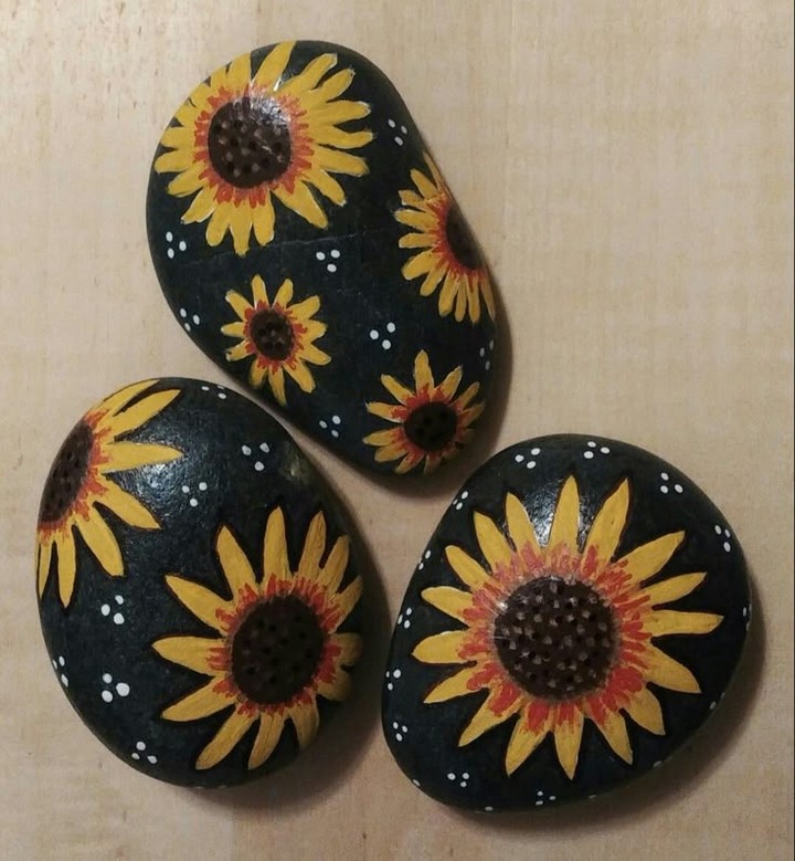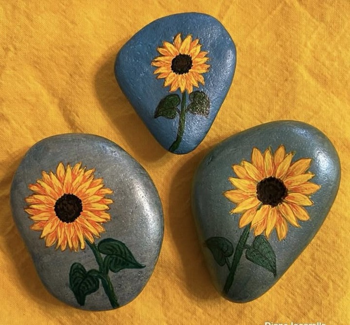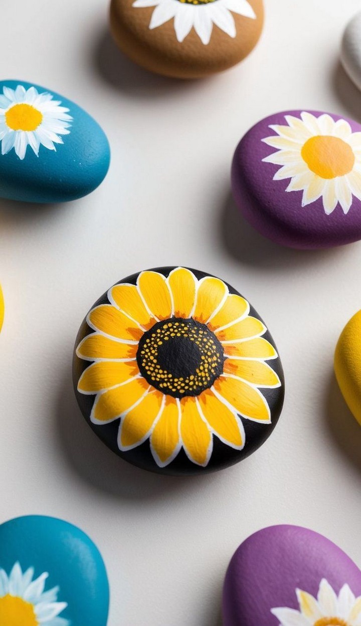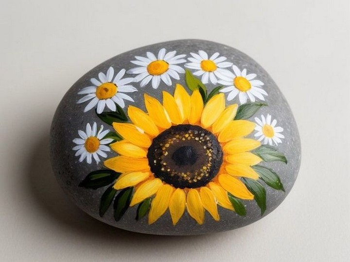 On a small rock, paint three tiny sunflowers with simplified petals and dot-like centers. Perfect for beginners or as part of a kindness rock project.