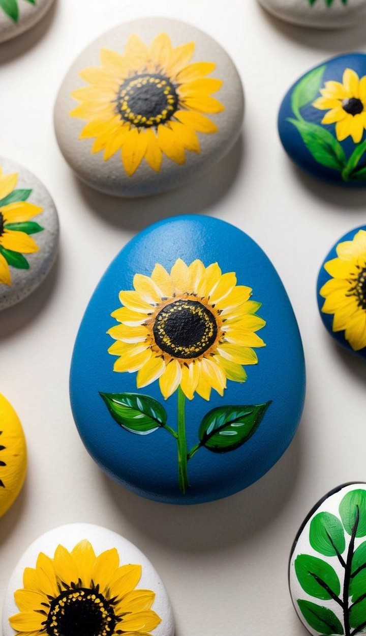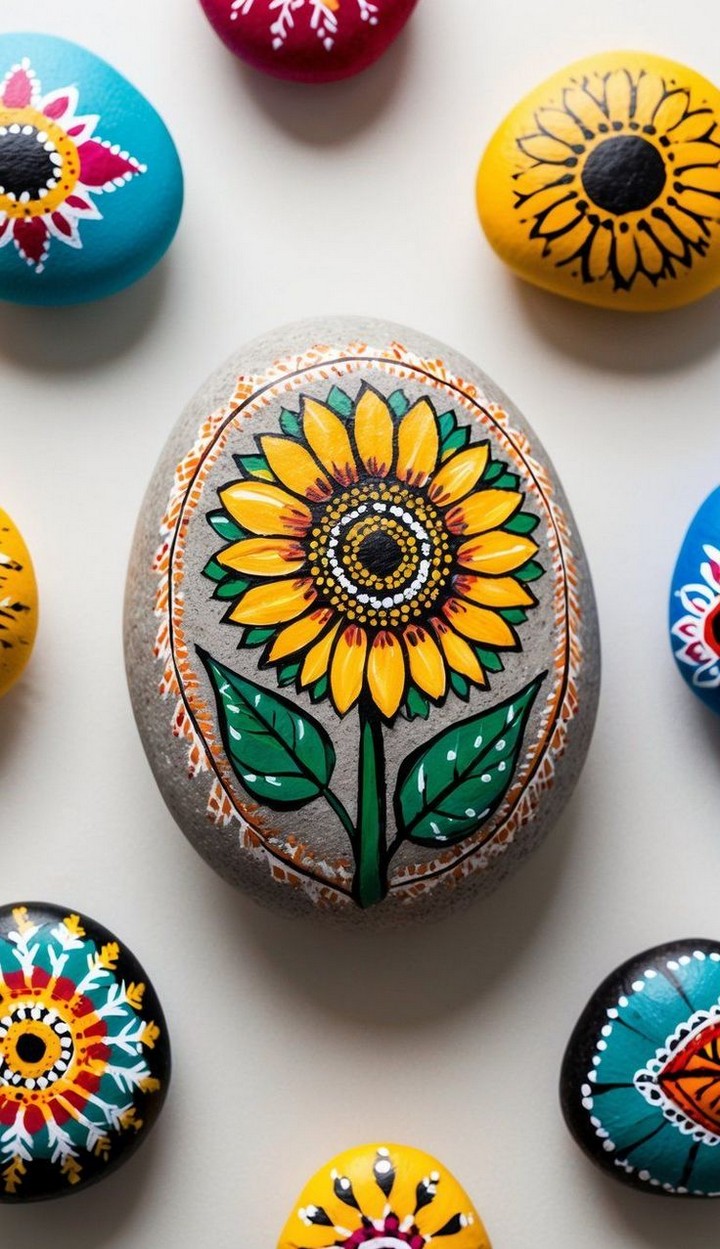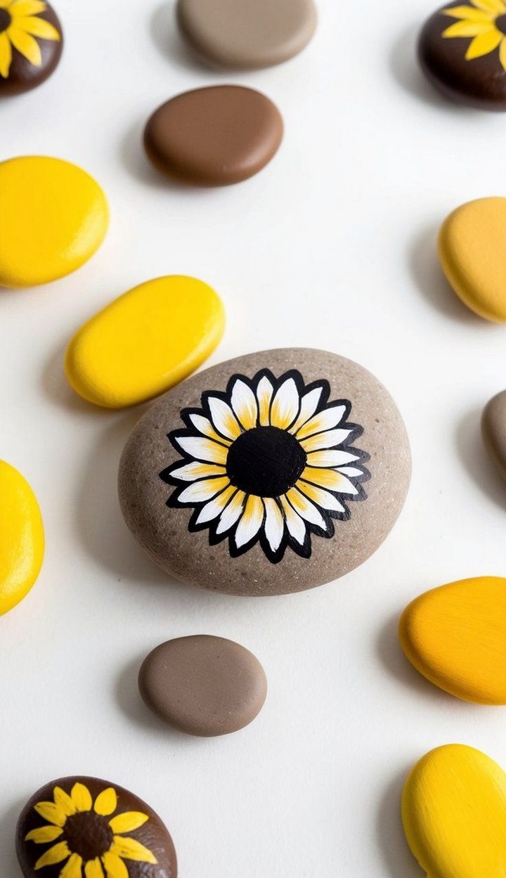 Sunflowers embody optimism and resilience, making them perfect subjects for rock art. Their bold yellow petals and distinctive dark centers translate beautifully onto stone surfaces, creating eye-catching pieces that radiate joy. The therapeutic nature of painting rocks combined with sunflowers’ uplifting symbolism creates a crafting experience that nourishes both creativity and well-being.