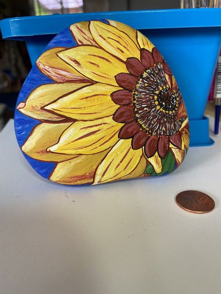 Paint just one oversized sunflower petal on a long, narrow rock, with a small portion of the center visible. This minimalist design is striking and easy to execute.