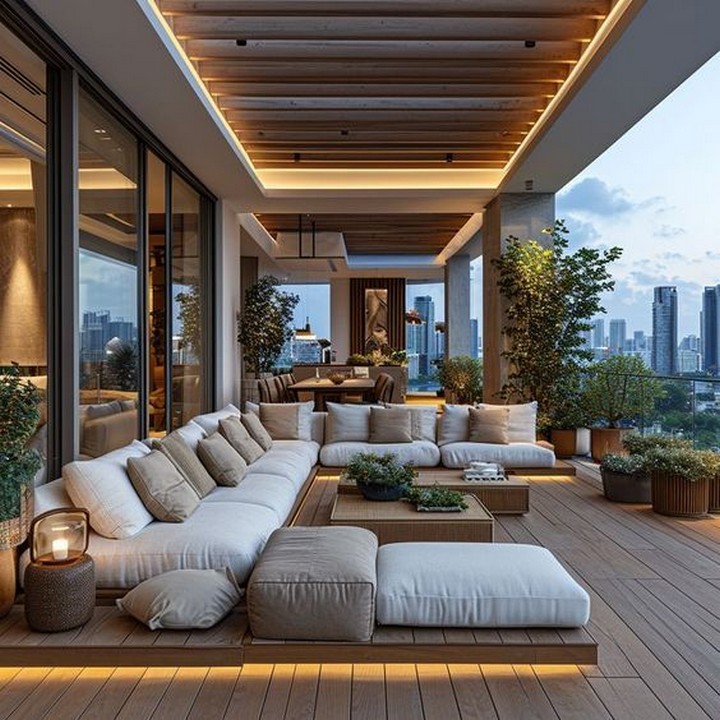 Create an outdoor living area with high-end furniture, a built-in grill, and a stylish pergola or gazebo. Add comfortable seating, a fire pit, and outdoor rugs to make your outdoor space a luxurious extension of your home.
