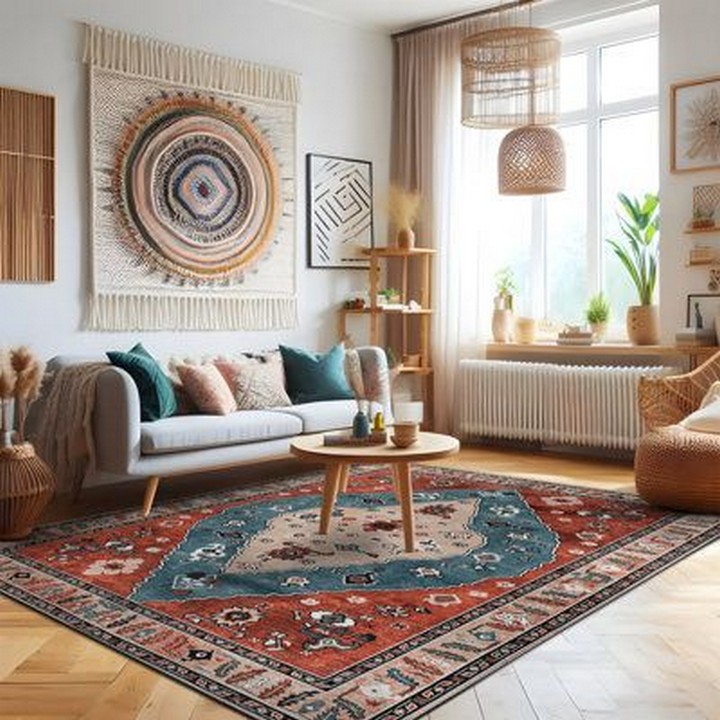Design a boho living space with vibrant colors, eclectic patterns, and a mix of textures. Use vintage rugs, macramé wall hangings, and layered textiles to create a cozy, artistic atmosphere.