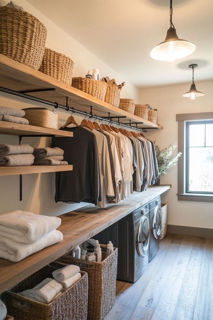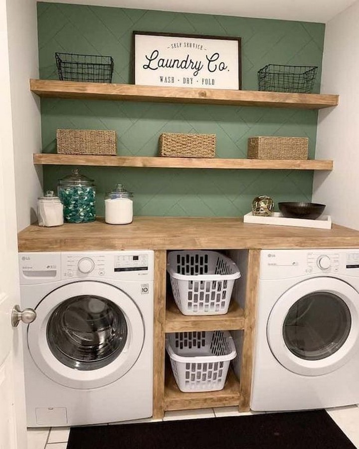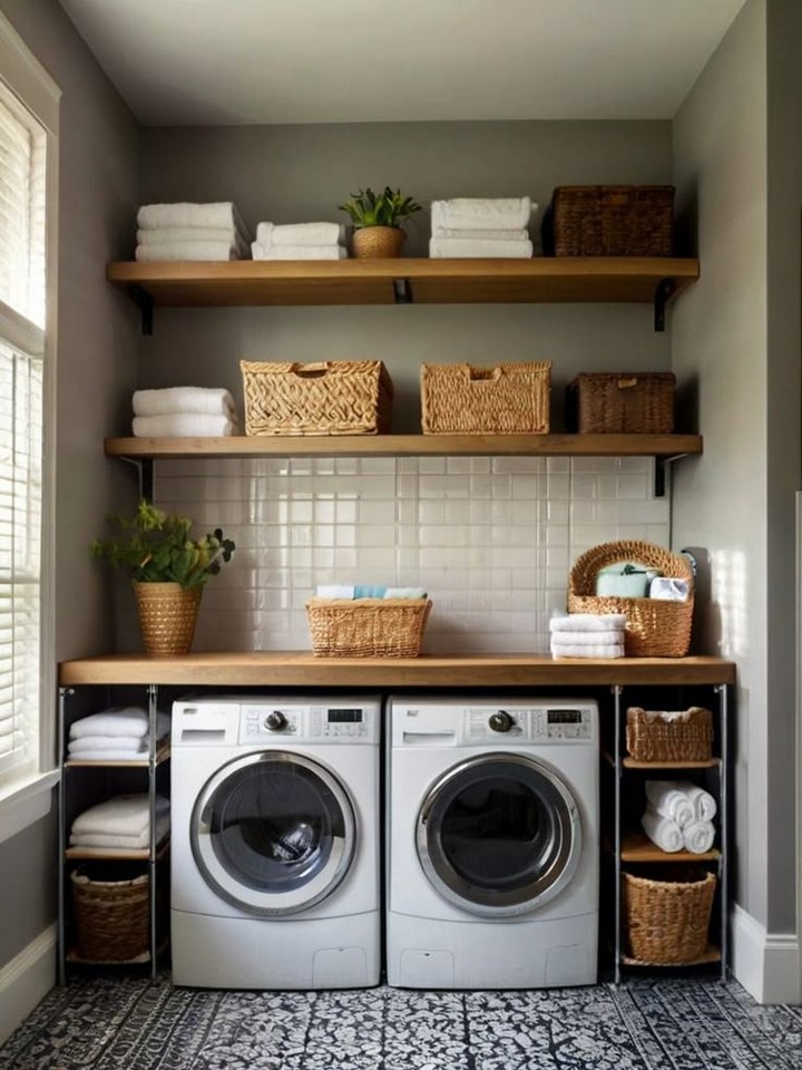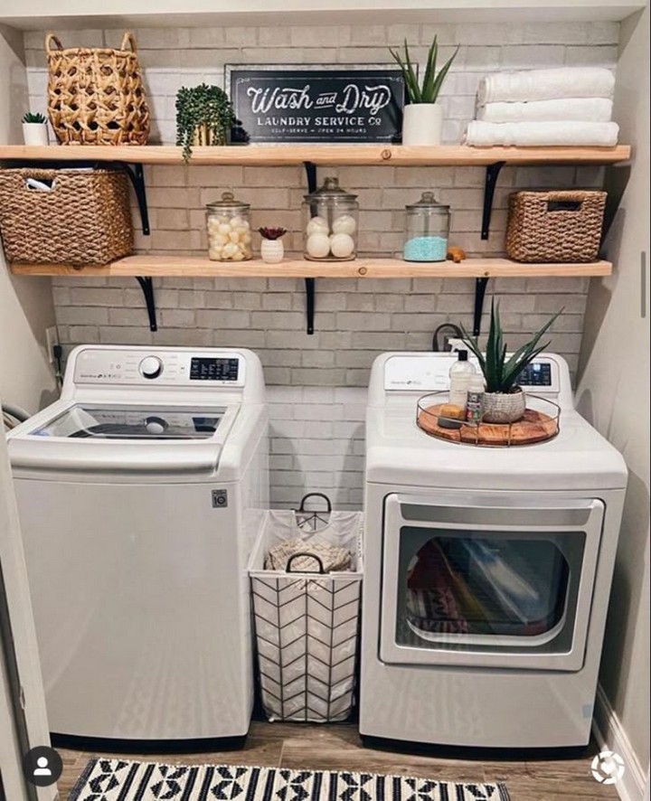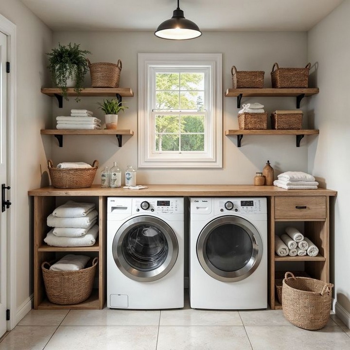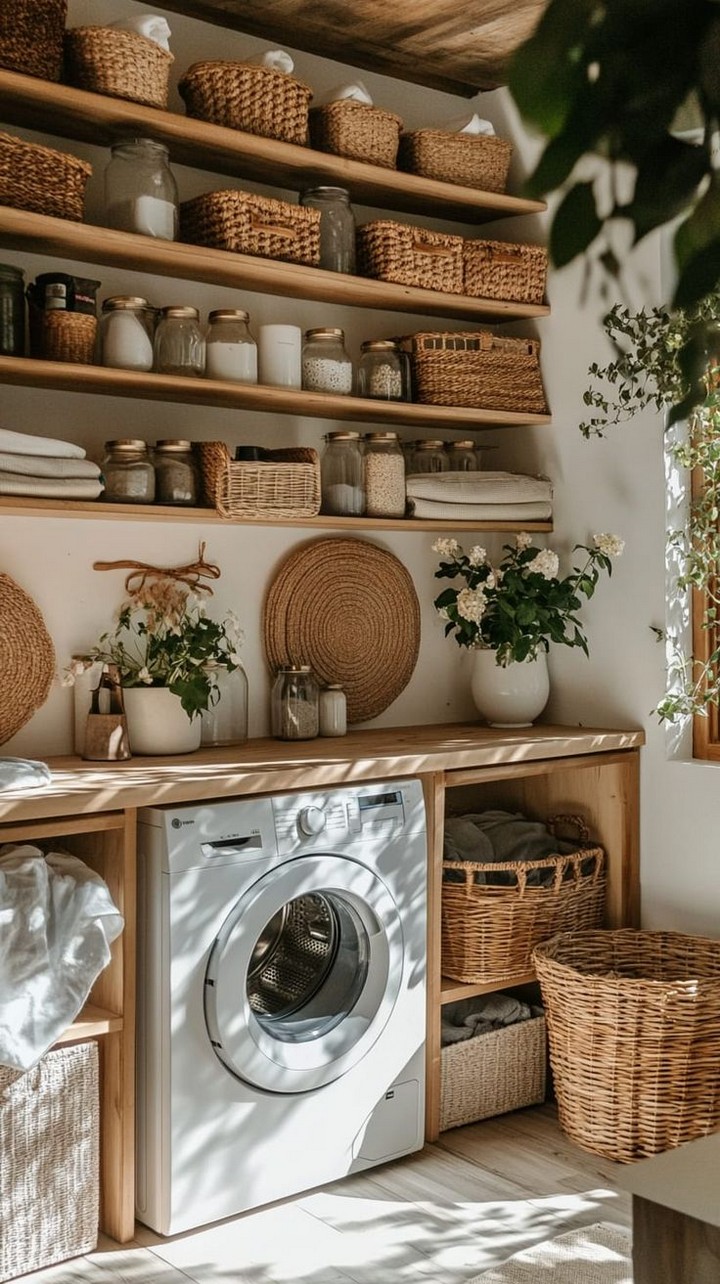 Ditch the upper cabinets and opt for open wooden shelves made from reclaimed wood. Fill them with wire baskets, mason jars, or woven bins for a charming and organized display. Not only does this make items accessible, but it also lets you style everyday laundry essentials into décor pieces.