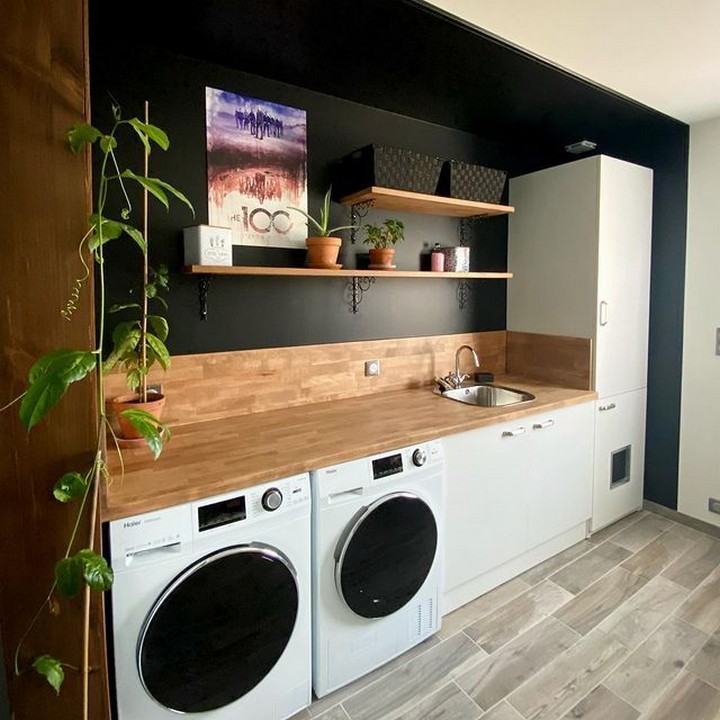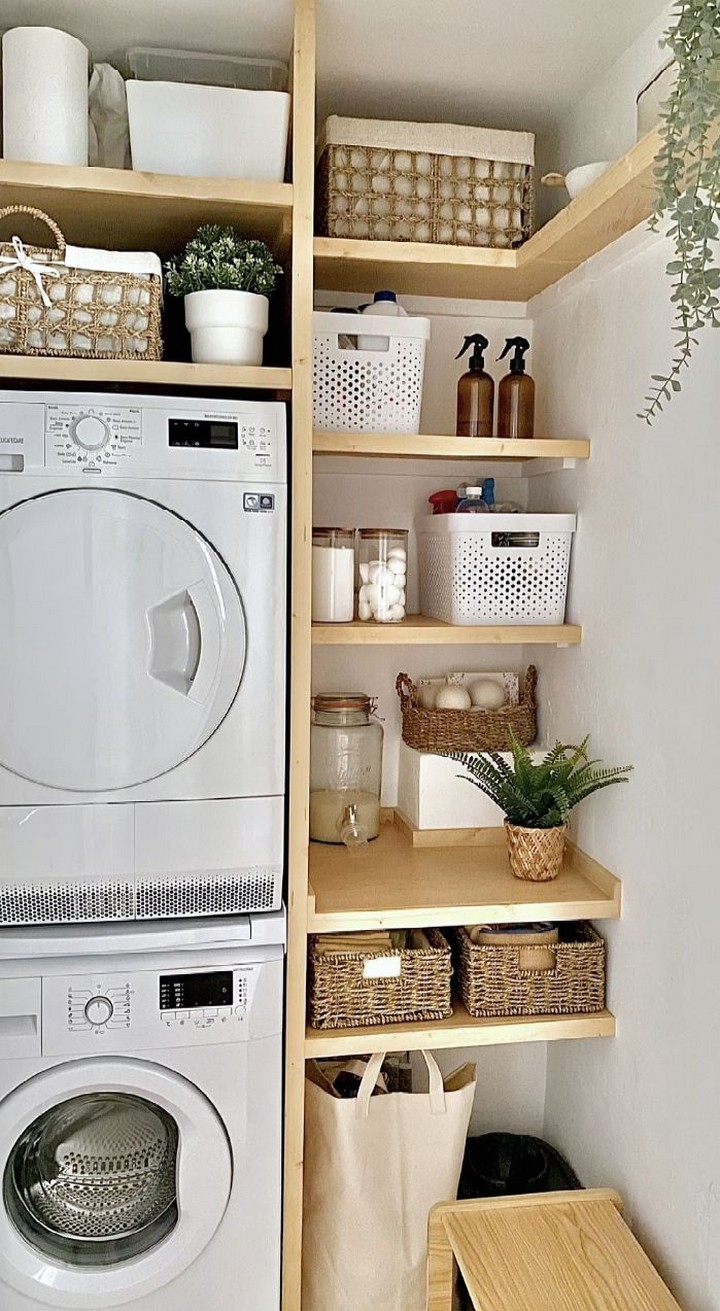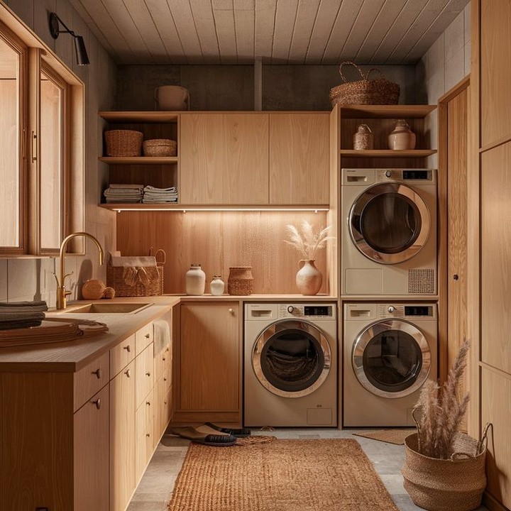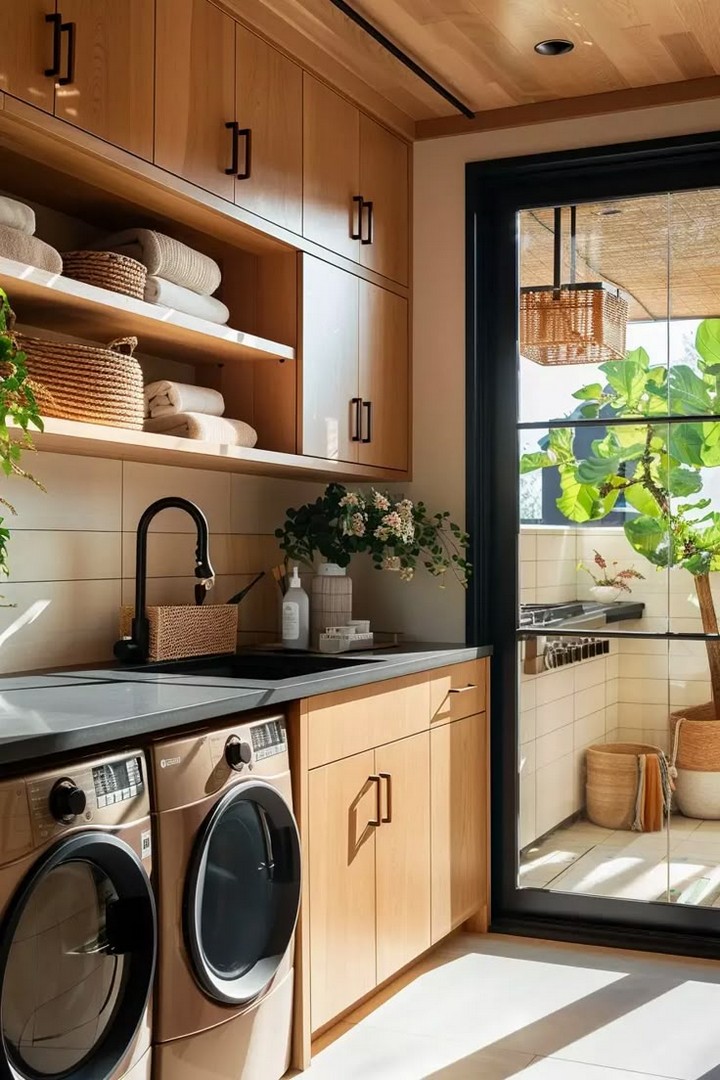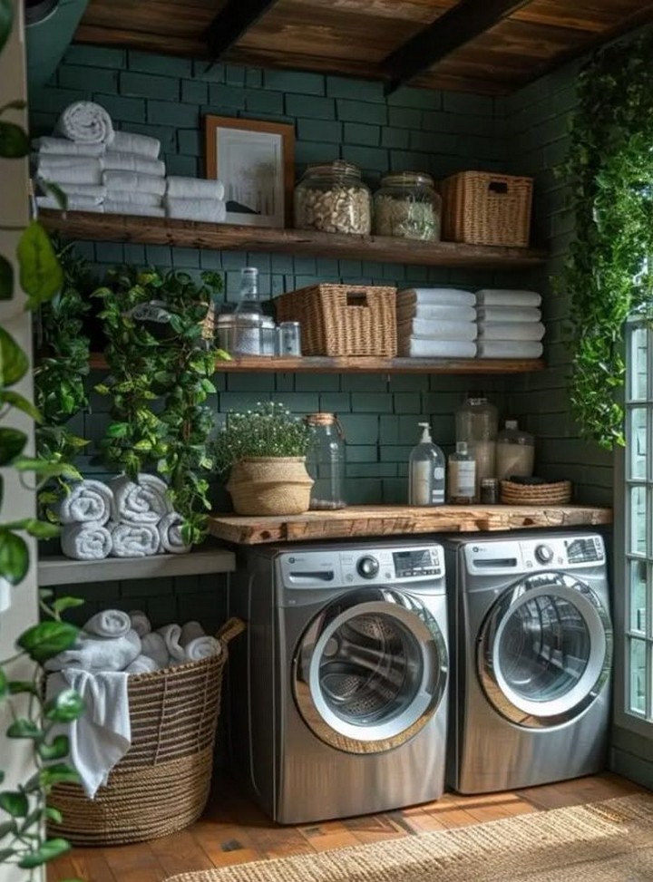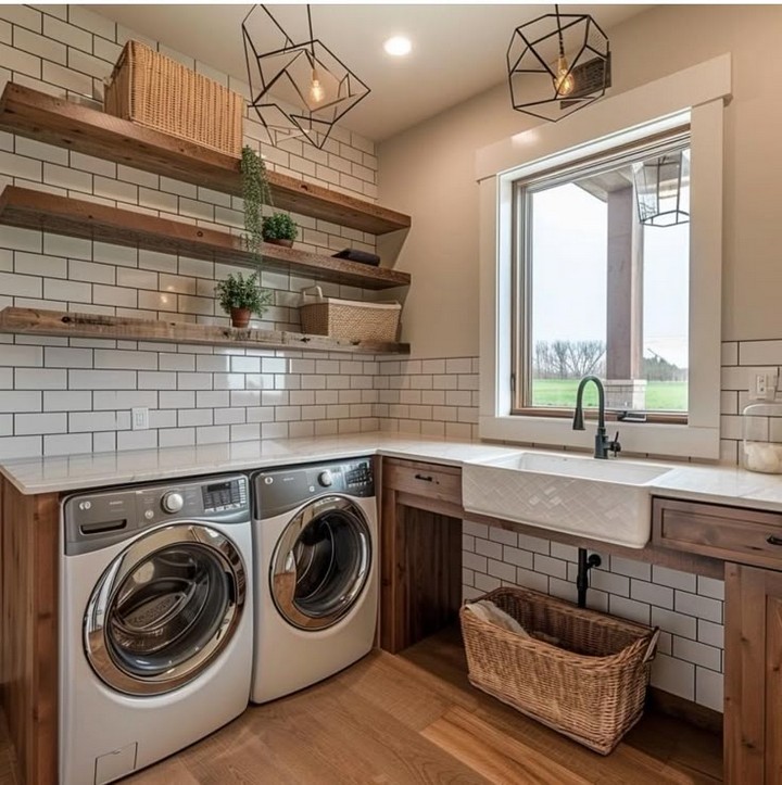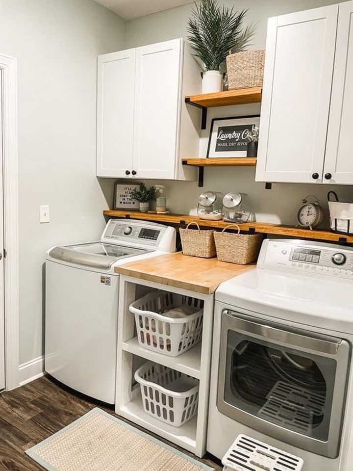 Ditch the upper cabinets and opt for open wooden shelves made from reclaimed wood. Fill them with wire baskets, mason jars, or woven bins for a charming and organized display. Not only does this make items accessible, but it also lets you style everyday laundry essentials into décor pieces.