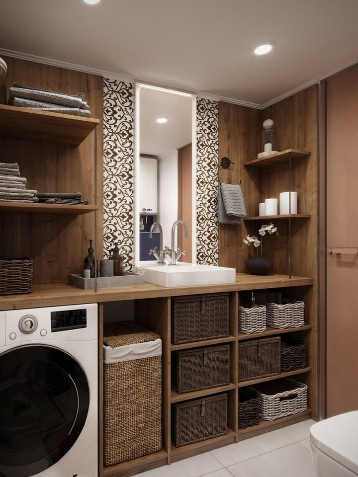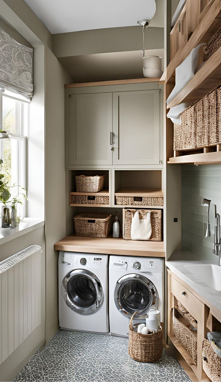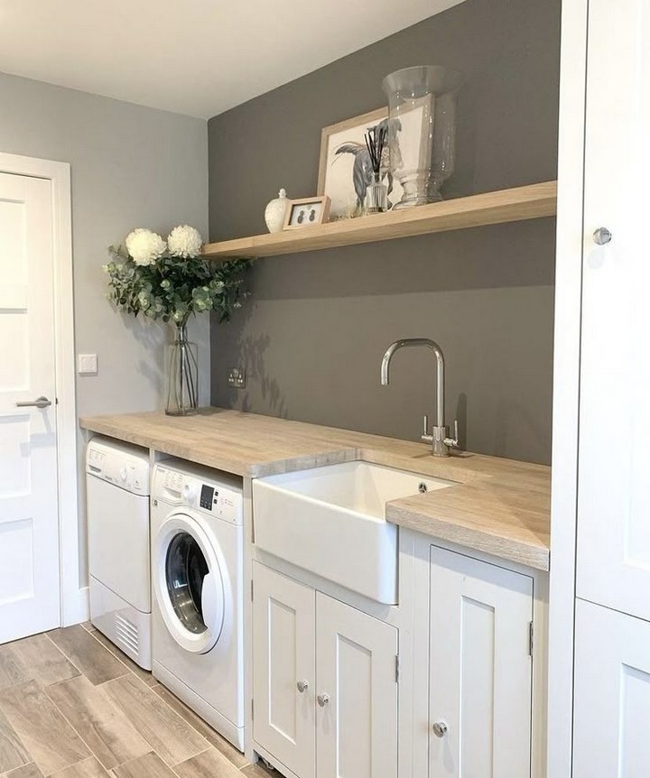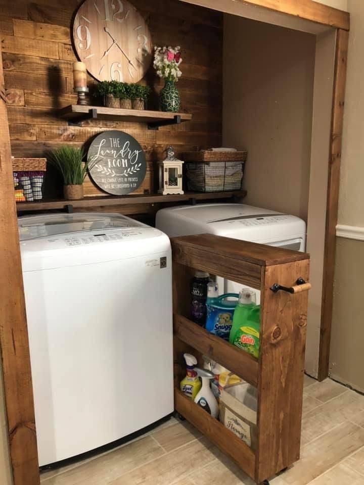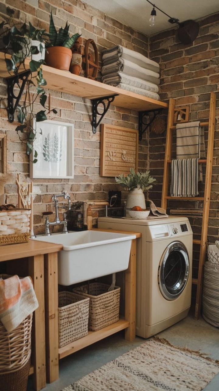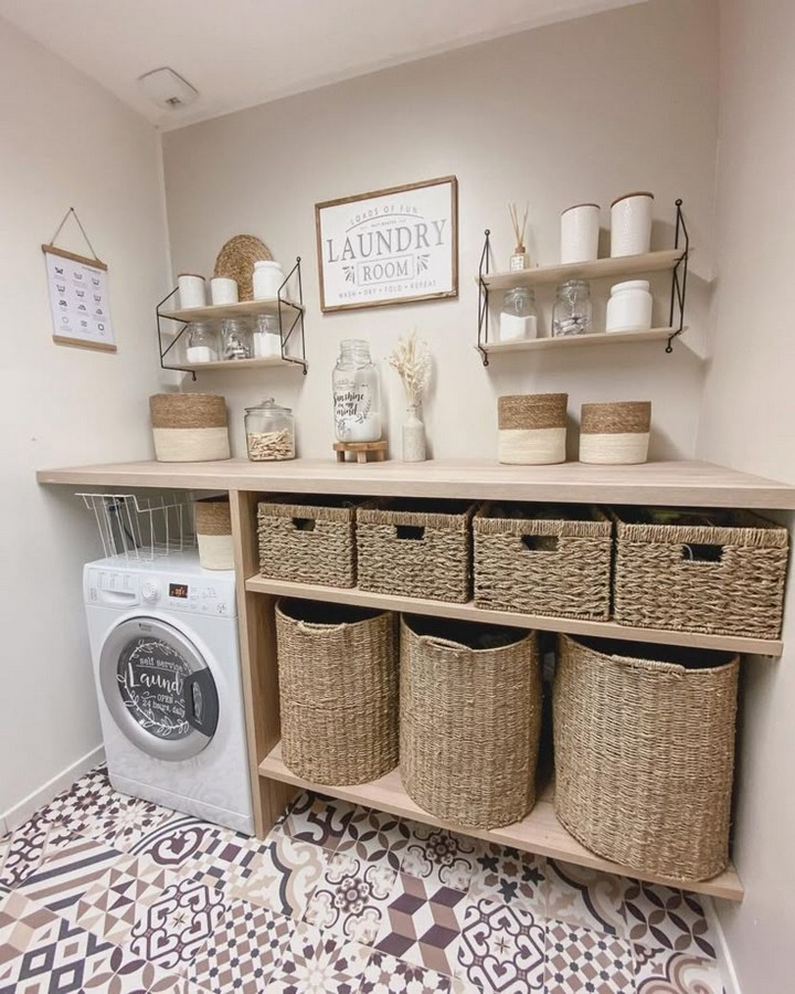 Ditch the upper cabinets and opt for open wooden shelves made from reclaimed wood. Fill them with wire baskets, mason jars, or woven bins for a charming and organized display. Not only does this make items accessible, but it also lets you style everyday laundry essentials into décor pieces.