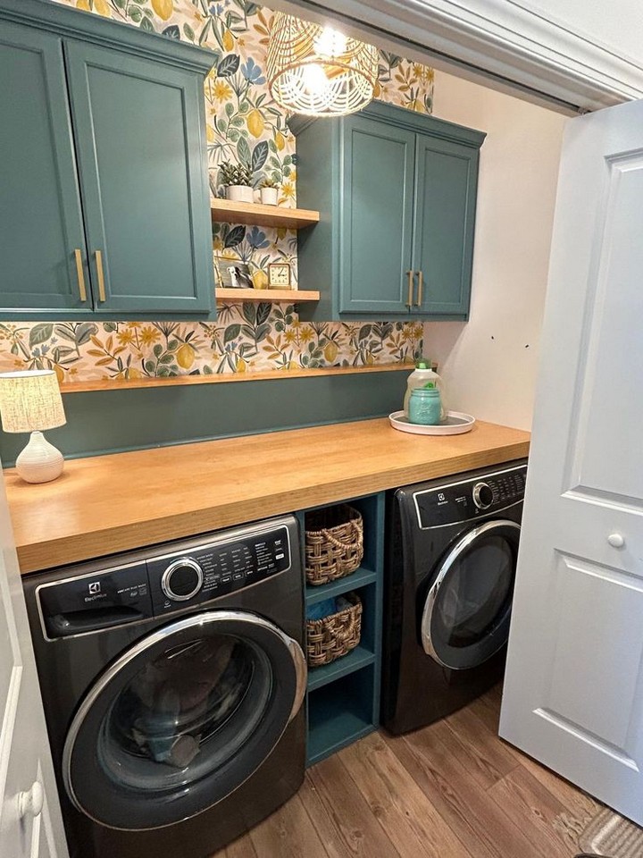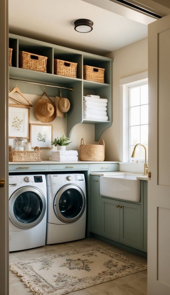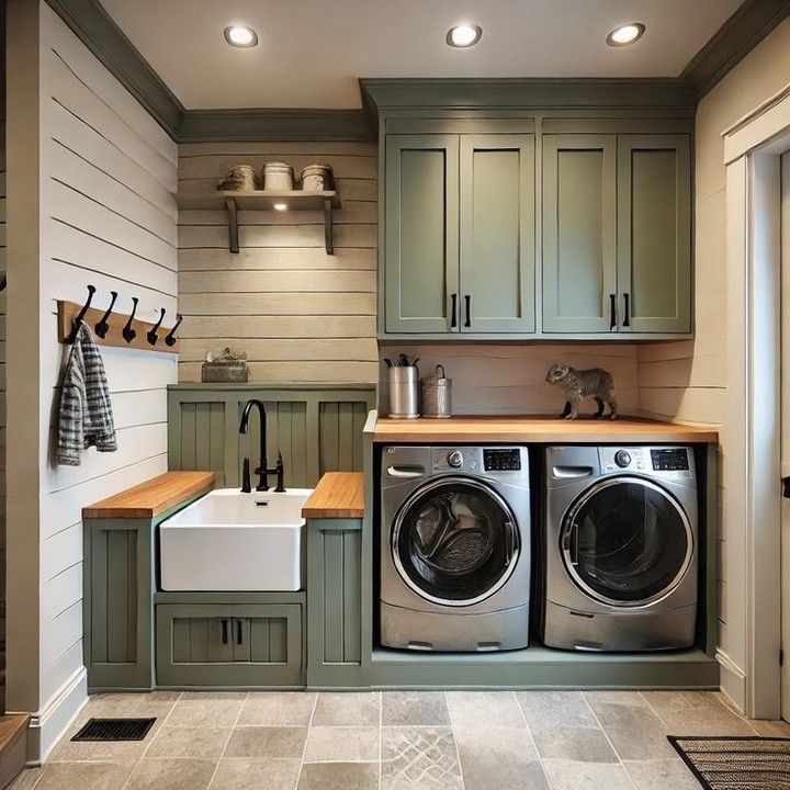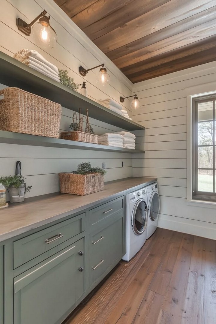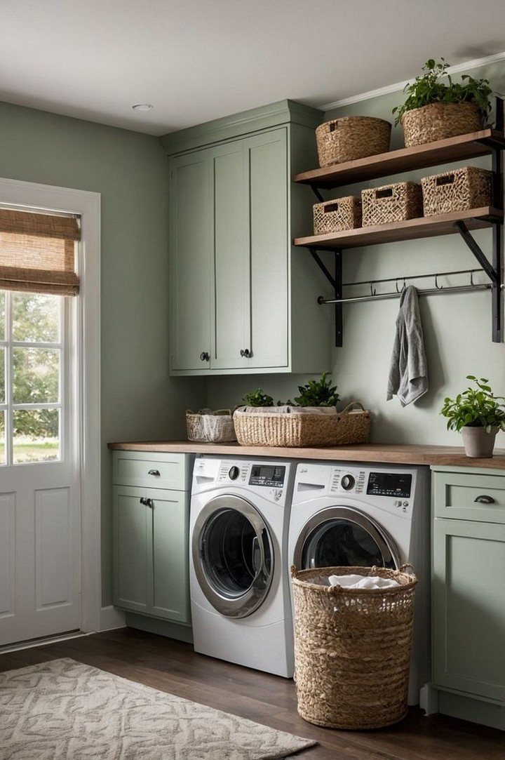 Sage green cabinets or walls create a calming effect and pair beautifully with wood or white accents. This subtle pop of color still aligns with farmhouse charm but adds a softer, more personalized touch to your laundry room without overwhelming the space.