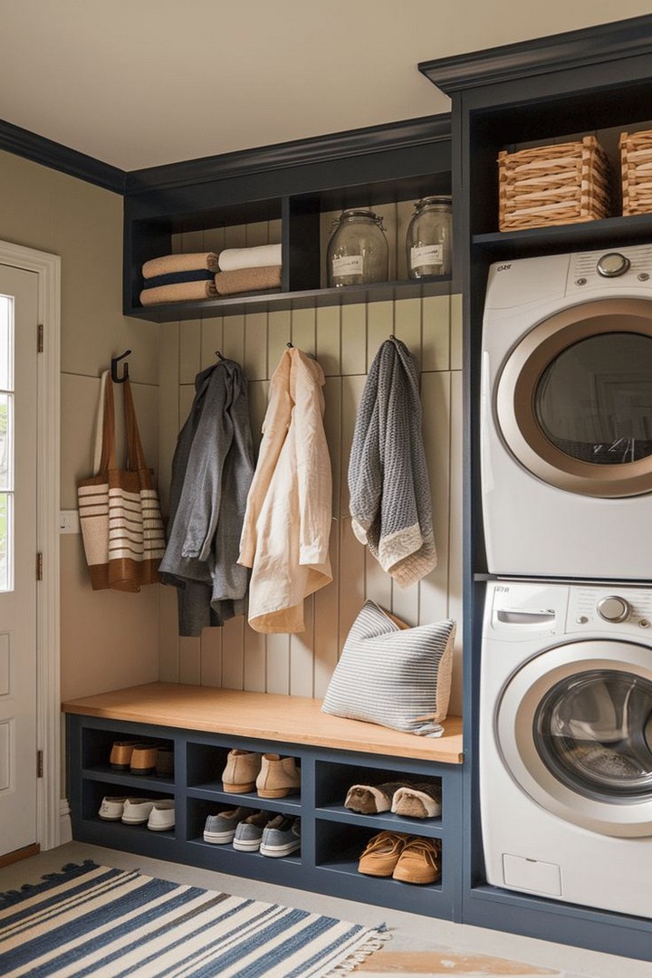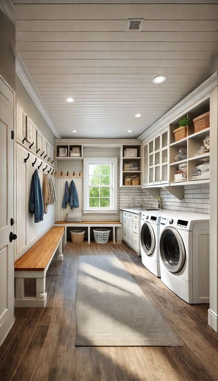 Combine your laundry area with a mudroom to get more from your space. Include wall hooks, benches, and cubbies for coats and shoes. This dual-purpose layout works great for busy households and, when done in wood and metal finishes, maintains the farmhouse look effortlessly.