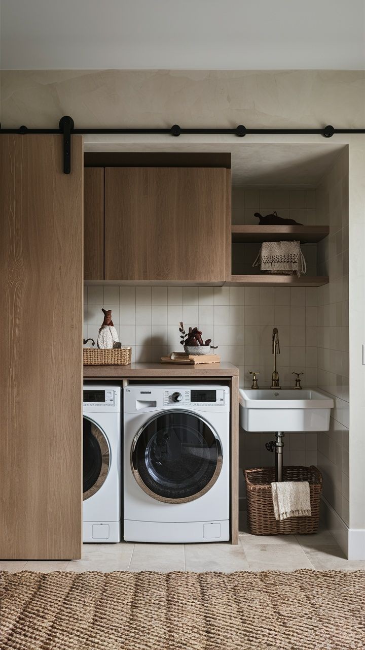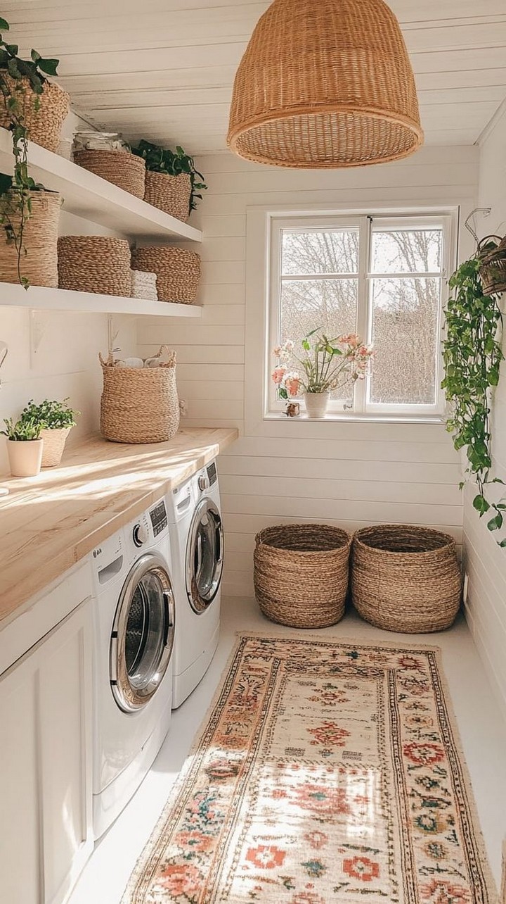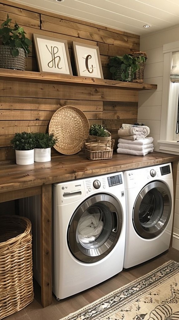 A galley layout is perfect for maximizing workflow. Place your washer and dryer on one side and folding space or storage on the other. Use butcher block countertops and painted shiplap walls to create a cozy corridor that’s both functional and reflective of farmhouse elegance.