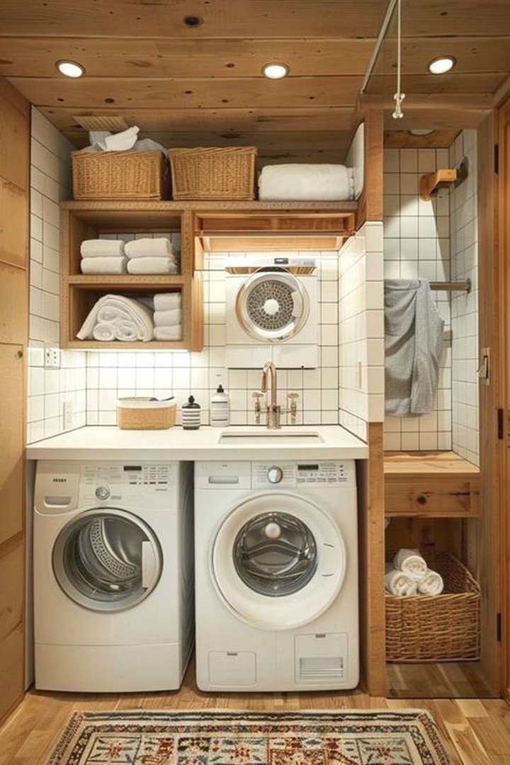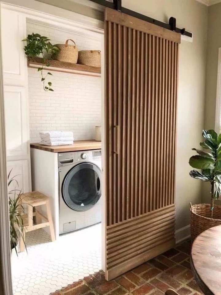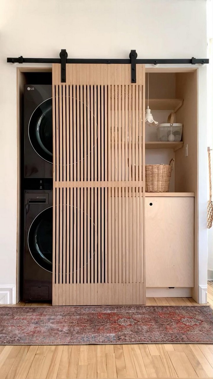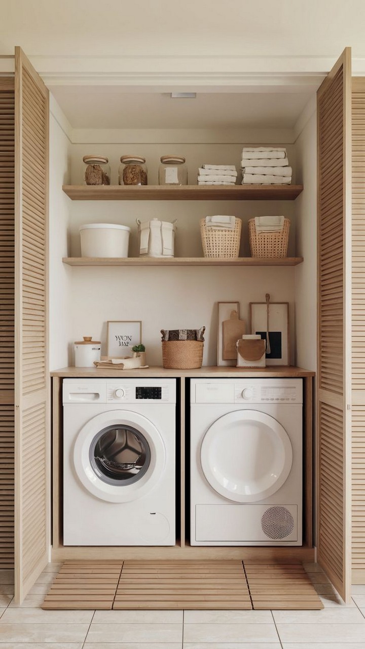 Turn a small closet into a hidden laundry zone. Use bi-fold or sliding barn doors to conceal the space when not in use. Add compact shelves above the machines and install a rod for hanging clothes. Use white and wood accents to keep it stylish and efficient.