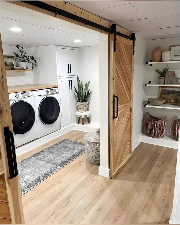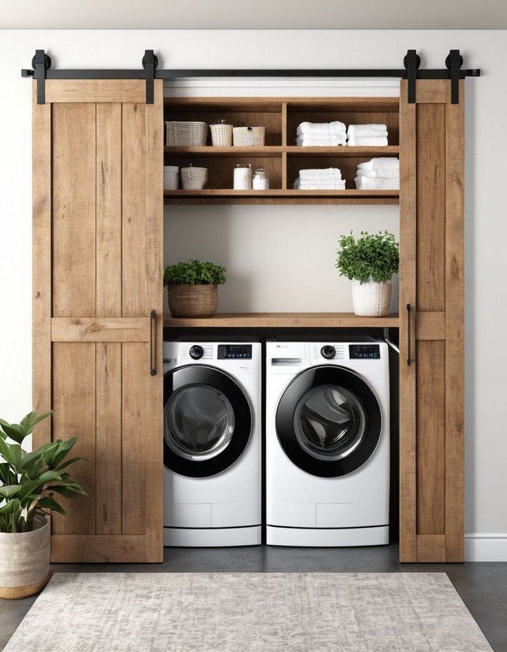 Sliding barn doors save space while adding rustic charm. Choose reclaimed wood or a whitewashed finish to match your laundry room’s palette. Add black iron hardware to complete the look. It’s the perfect solution for separating your laundry room from adjoining spaces without losing style.