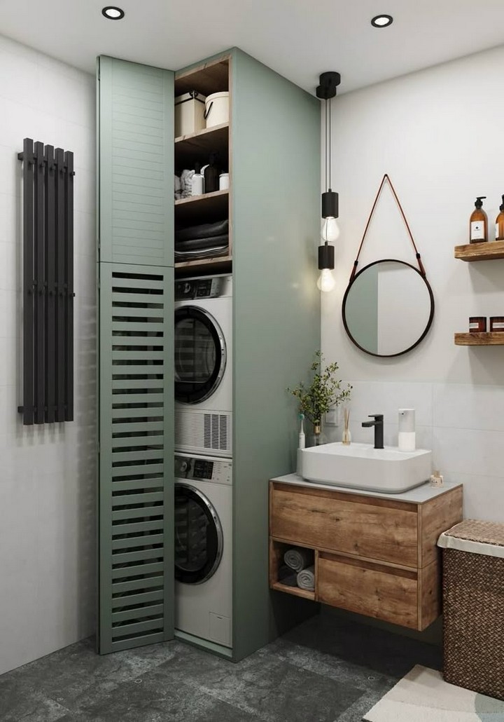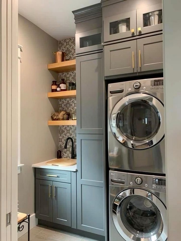 When space is tight, a stacked washer-dryer setup is the ultimate hack. You’ll free up room for built-in storage, folding counters, or even a utility sink. Add custom cabinetry around the machines to maintain a cohesive aesthetic while maximizing vertical space in true farmhouse fashion.