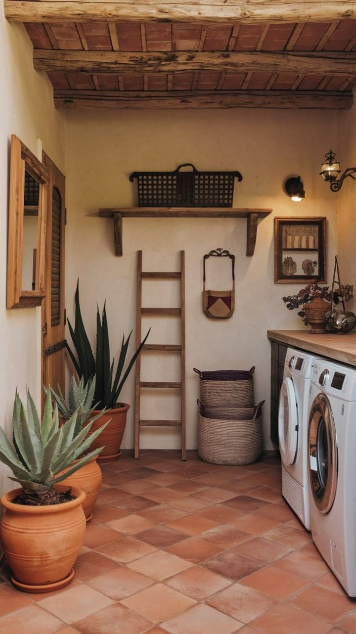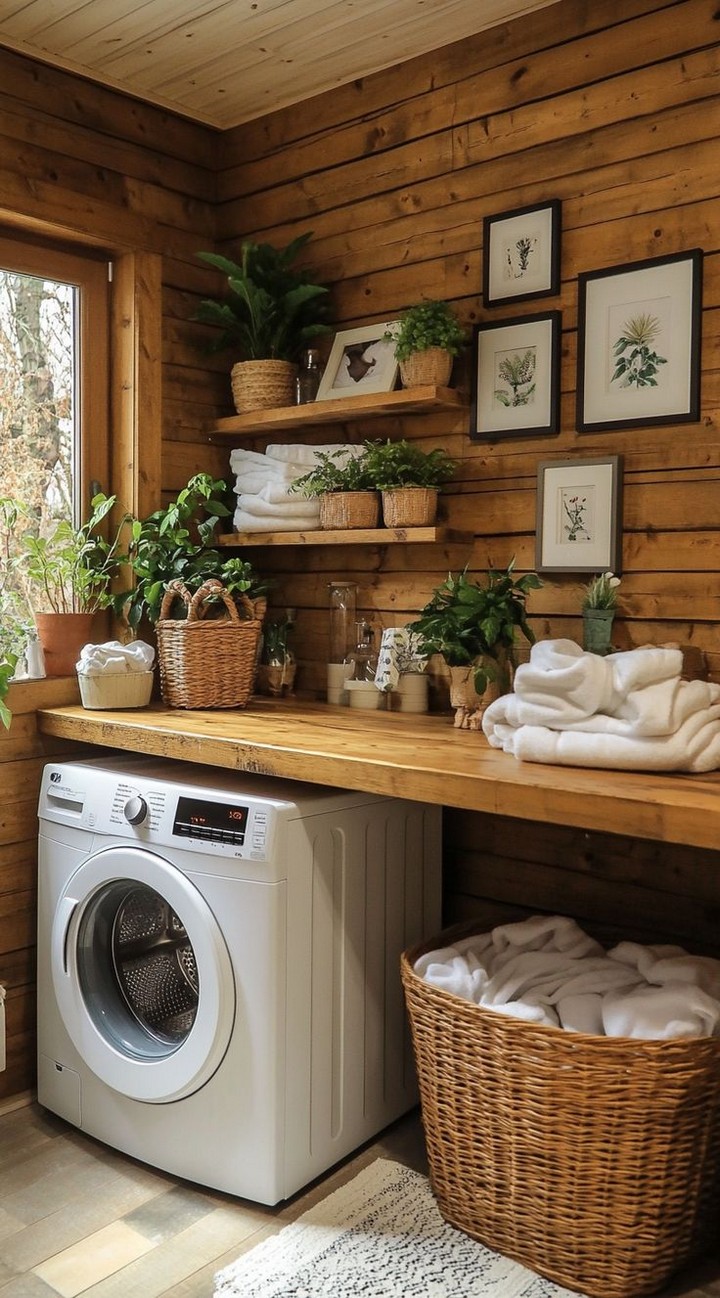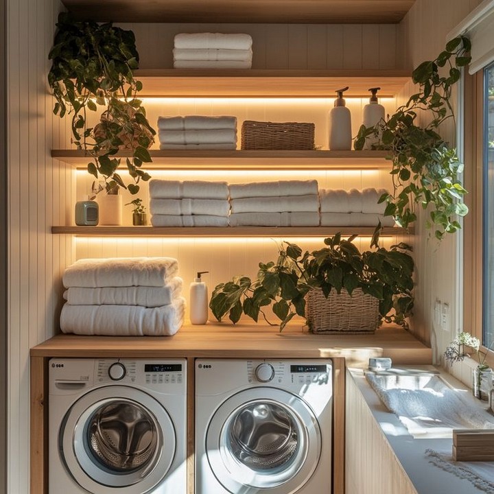 Liven up your laundry space with potted plants, eucalyptus stems, or hanging greenery. Choose low-light plants like snake plants or faux options for easy maintenance. Greenery softens the harder elements of the room and reinforces the natural farmhouse aesthetic.