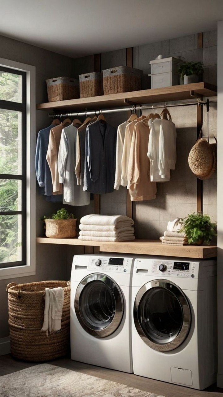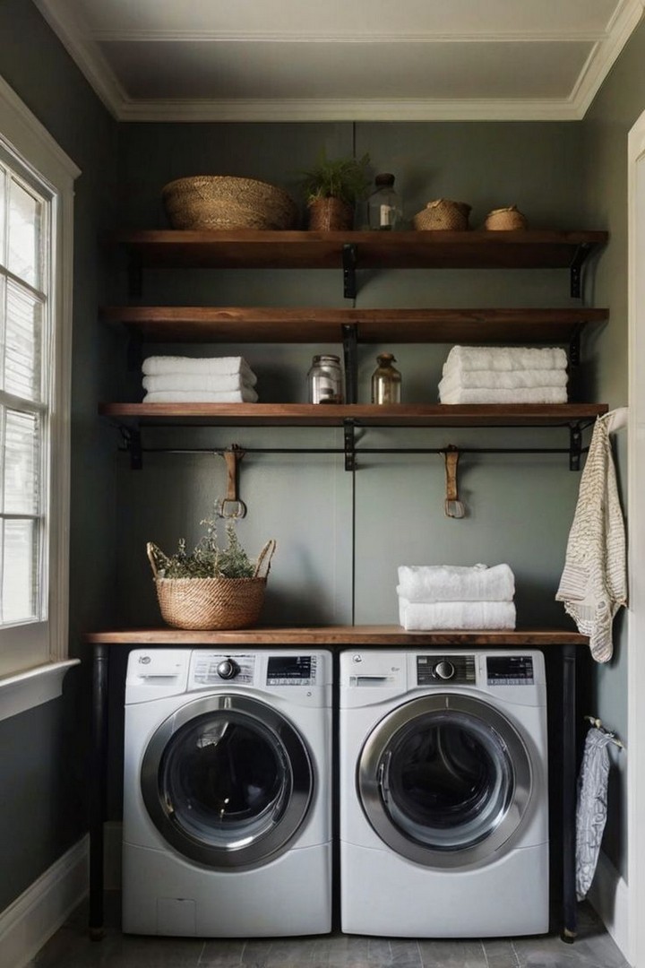 Install a ceiling-mounted or retractable drying rack above your machines or sink. Wood slats and iron brackets create a vintage-inspired look while serving a functional purpose. It’s perfect for drying delicates or dish towels, and when not in use, it tucks away, preserving space and charm.