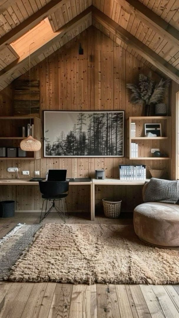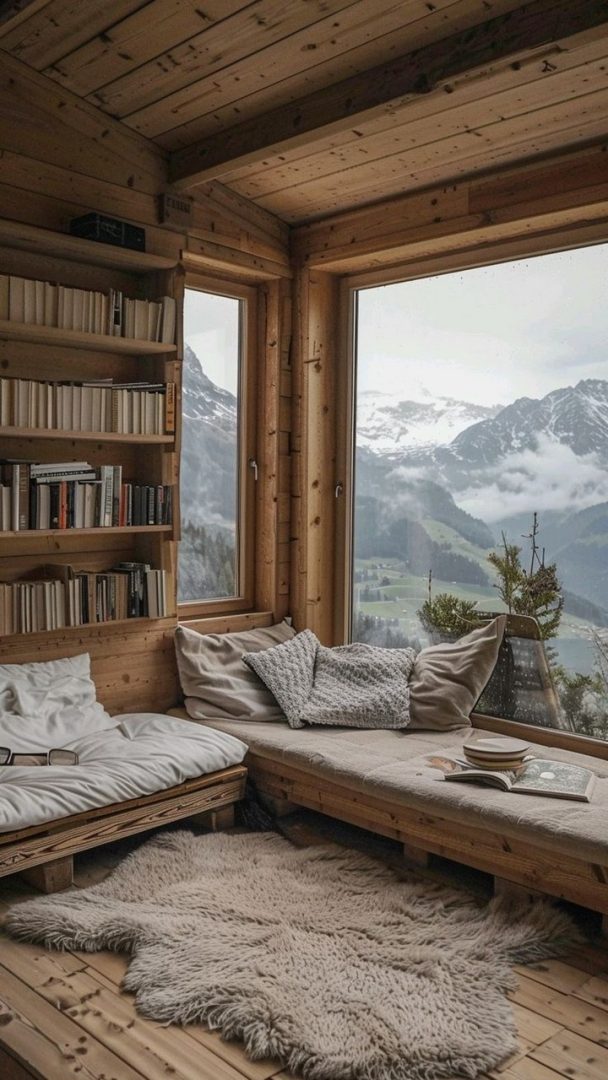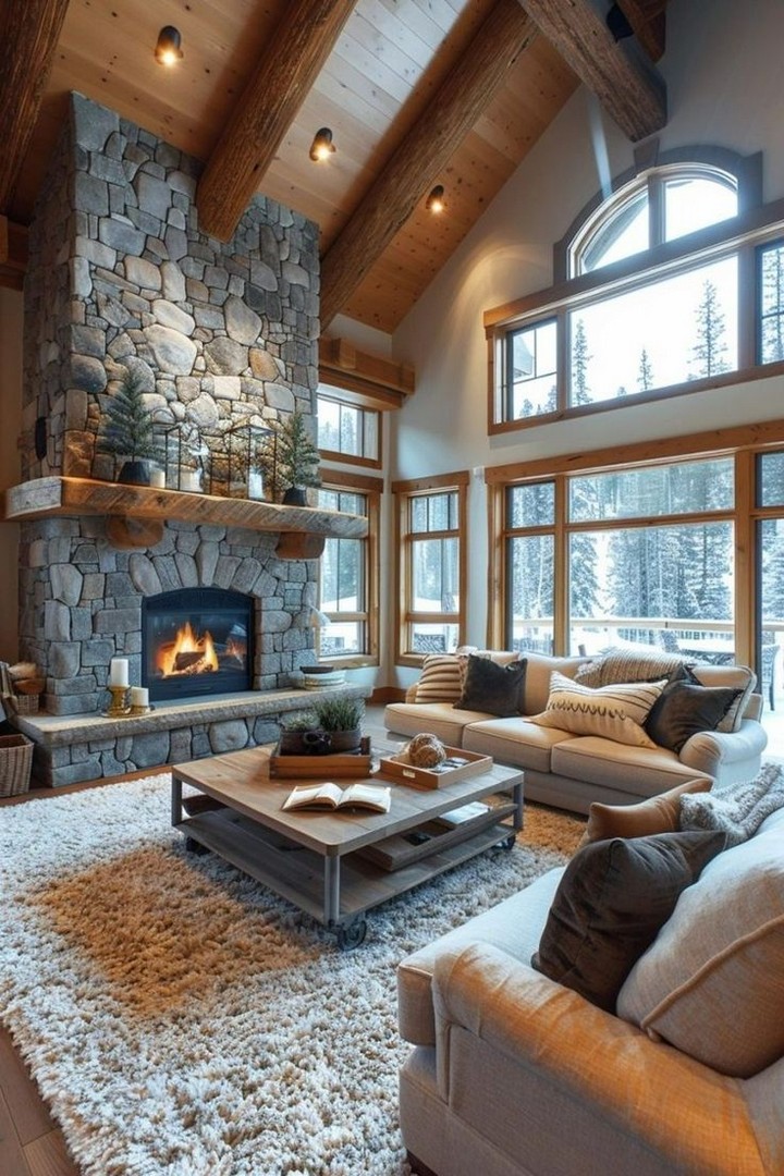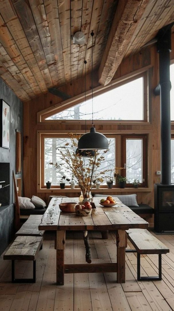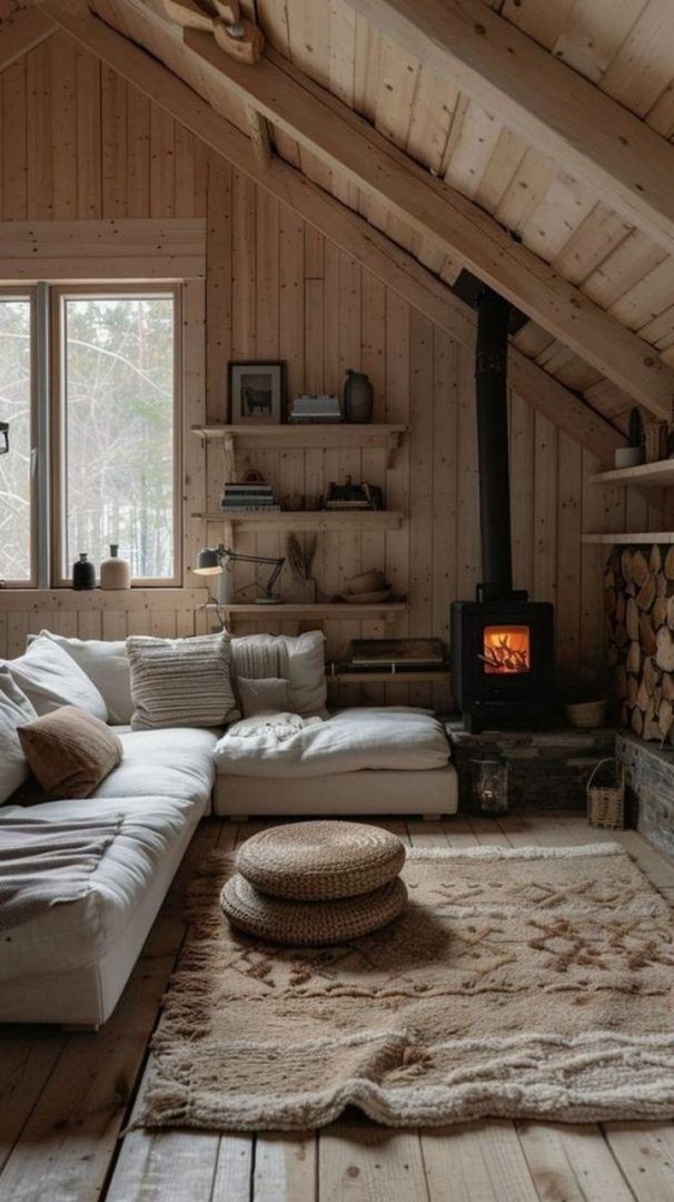 Use natural materials like wood, stone, and wool to create an authentic Scandinavian feel. Exposed wooden beams, stone fireplaces, and wooden floors add warmth and texture to your cabin’s interior.