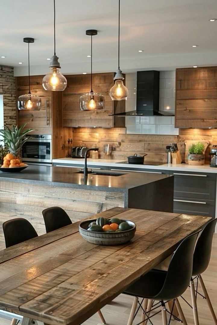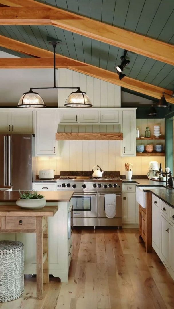 Create a Scandinavian kitchen with simple cabinetry, functional appliances, and clean lines. Use natural materials like wood and stone for countertops and backsplashes to enhance the cabin’s cozy vibe.