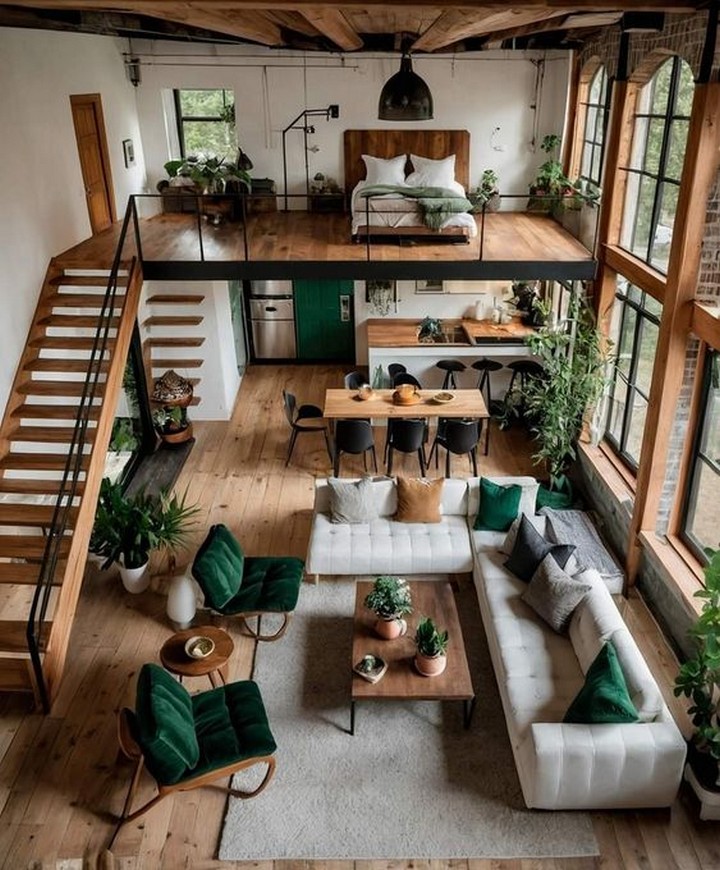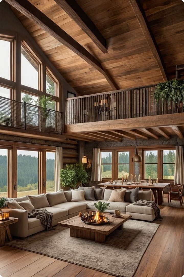Incorporate natural wood accents throughout the cabin, such as wooden beams, staircases, and furniture. Light or honey-toned woods create a warm, inviting atmosphere.