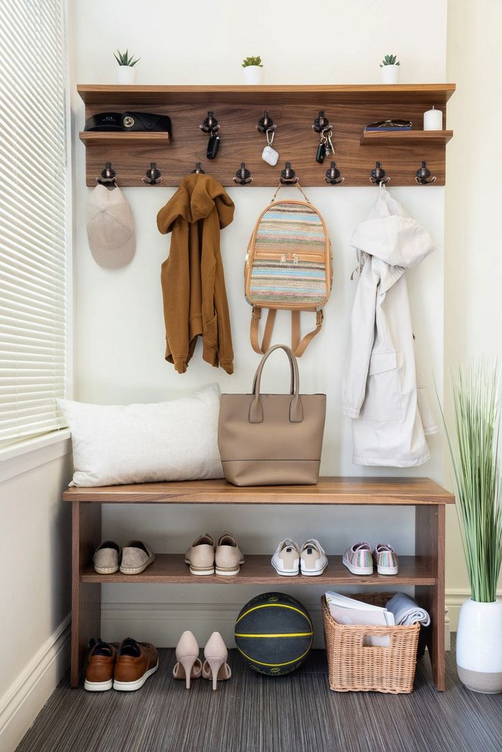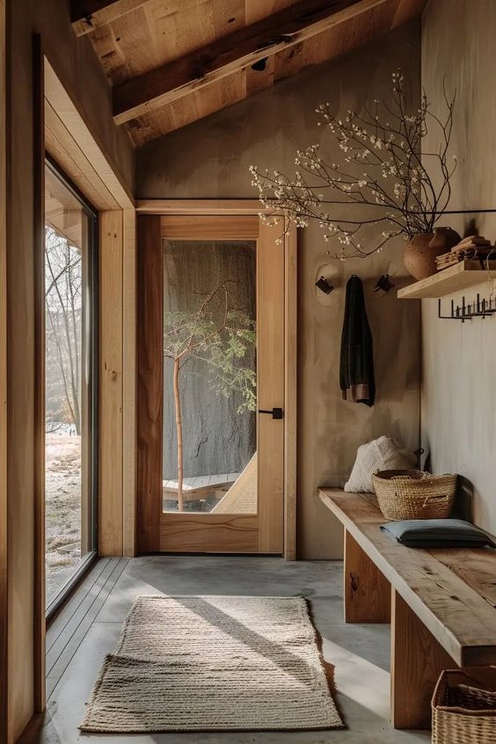 Incorporate functional entry storage with built-in benches, coat hooks, and shoe racks. This practical setup helps keep the cabin organized while providing a stylish and welcoming entry area.