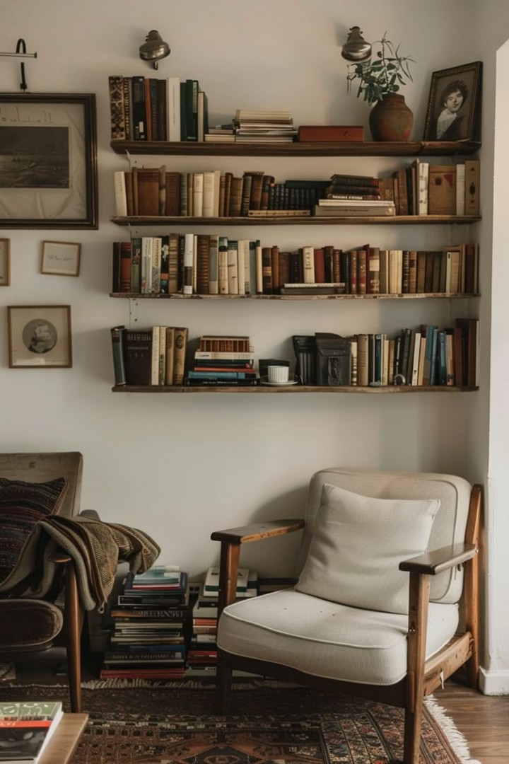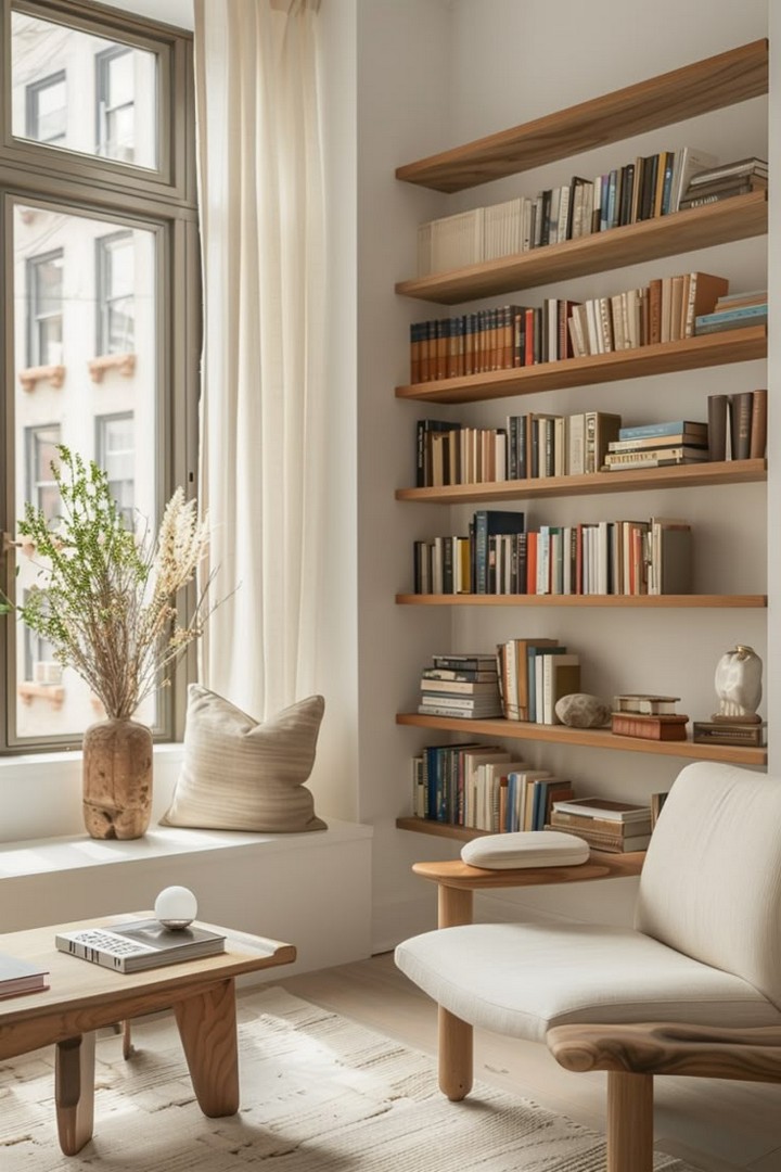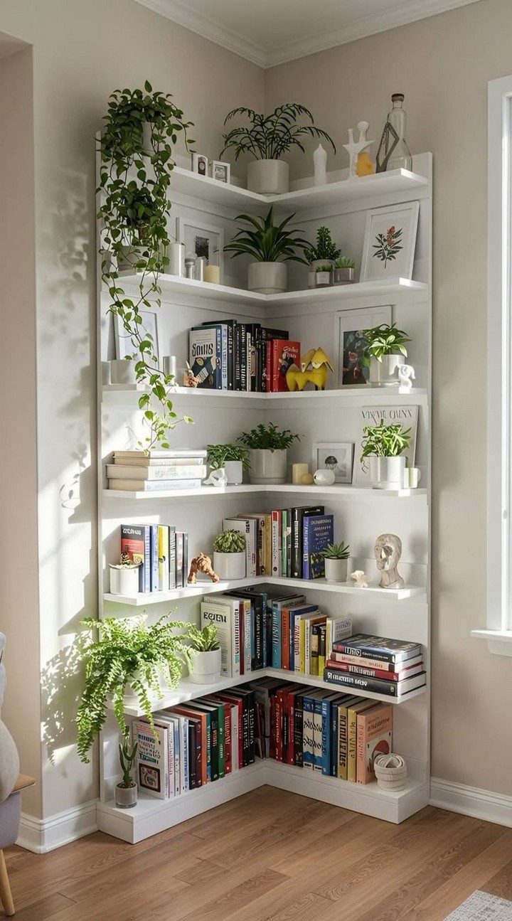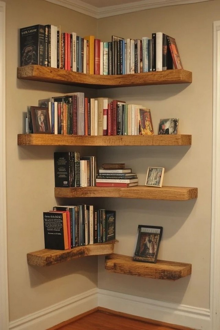 Install sleek floating shelves in a corner for a minimalist, modern look. Perfect for smaller spaces, these shelves keep the focus on your books and décor.