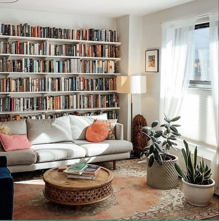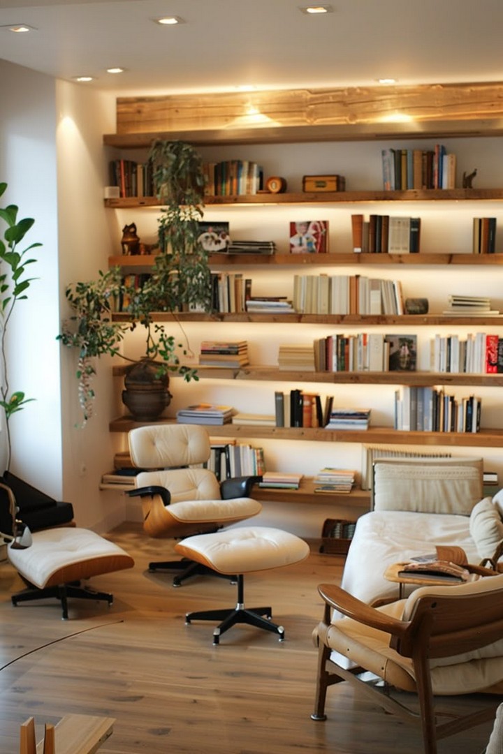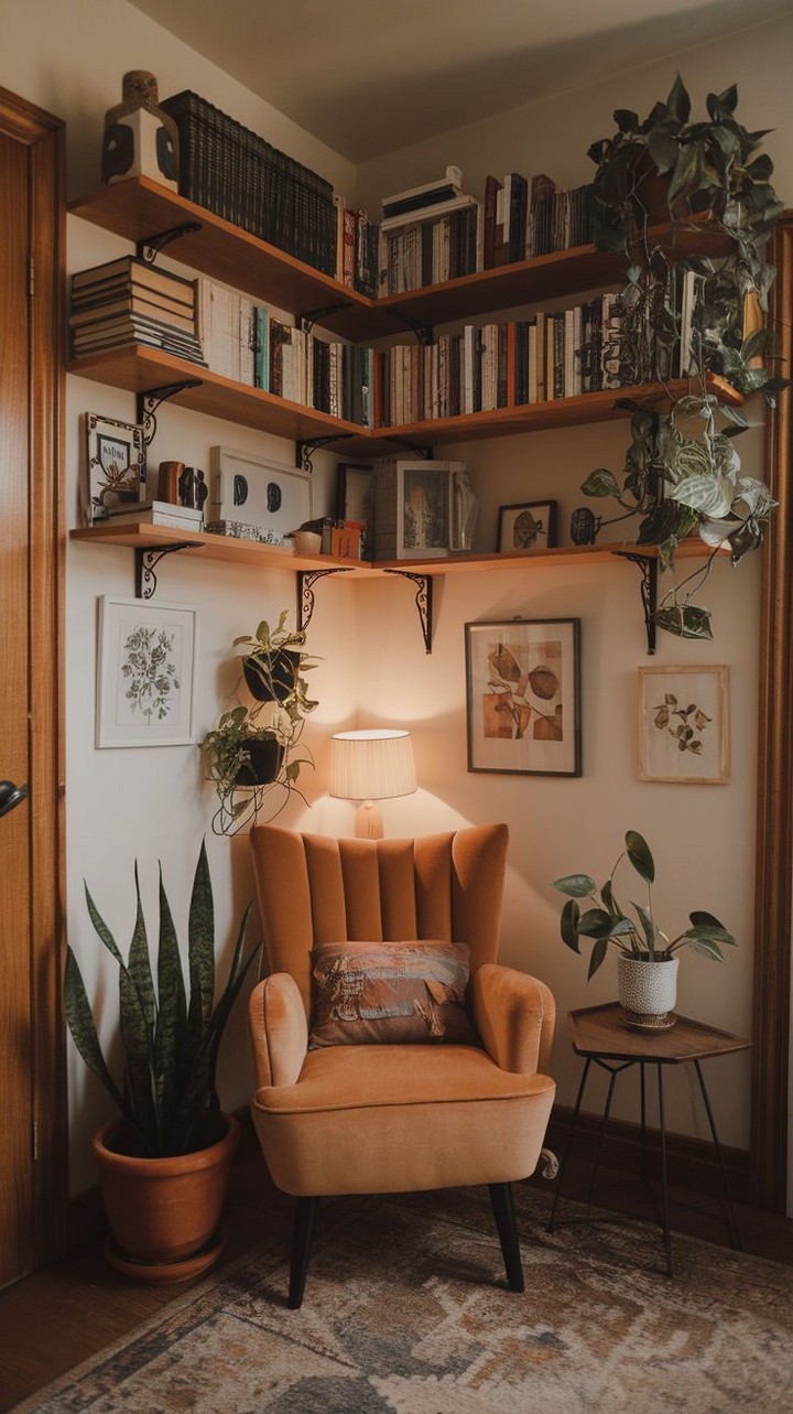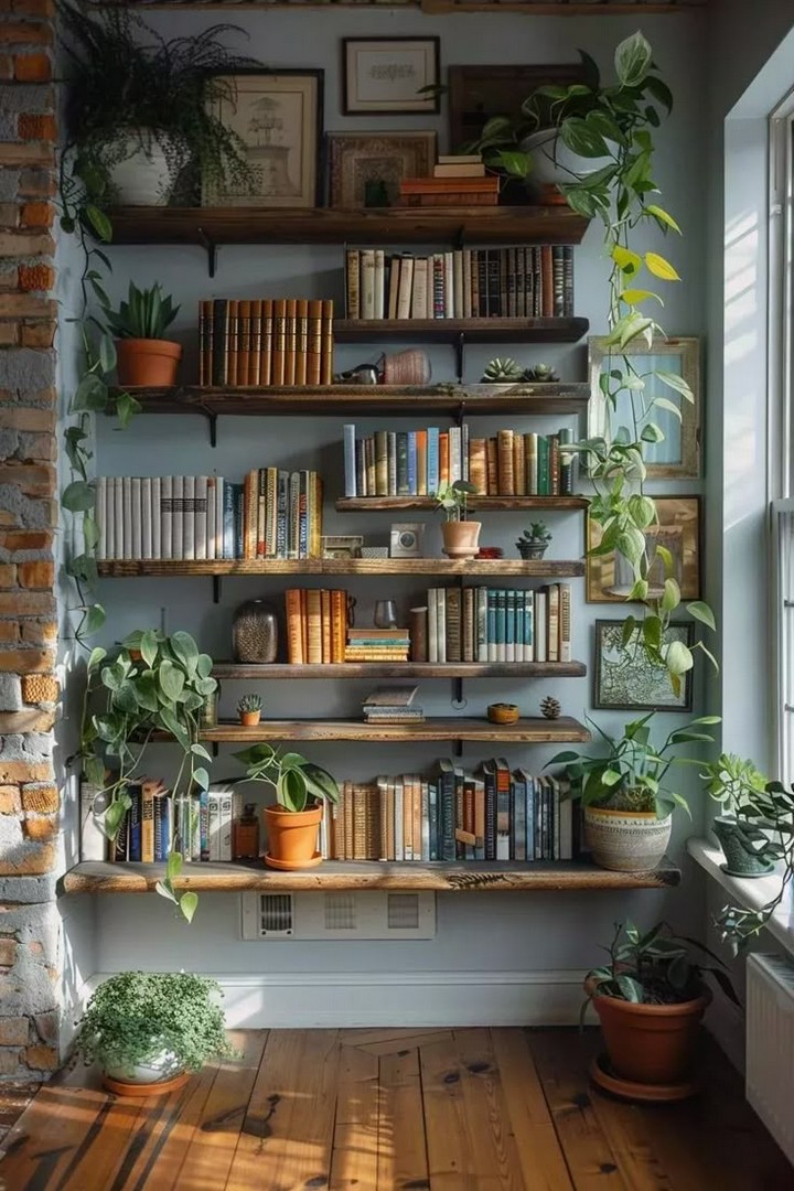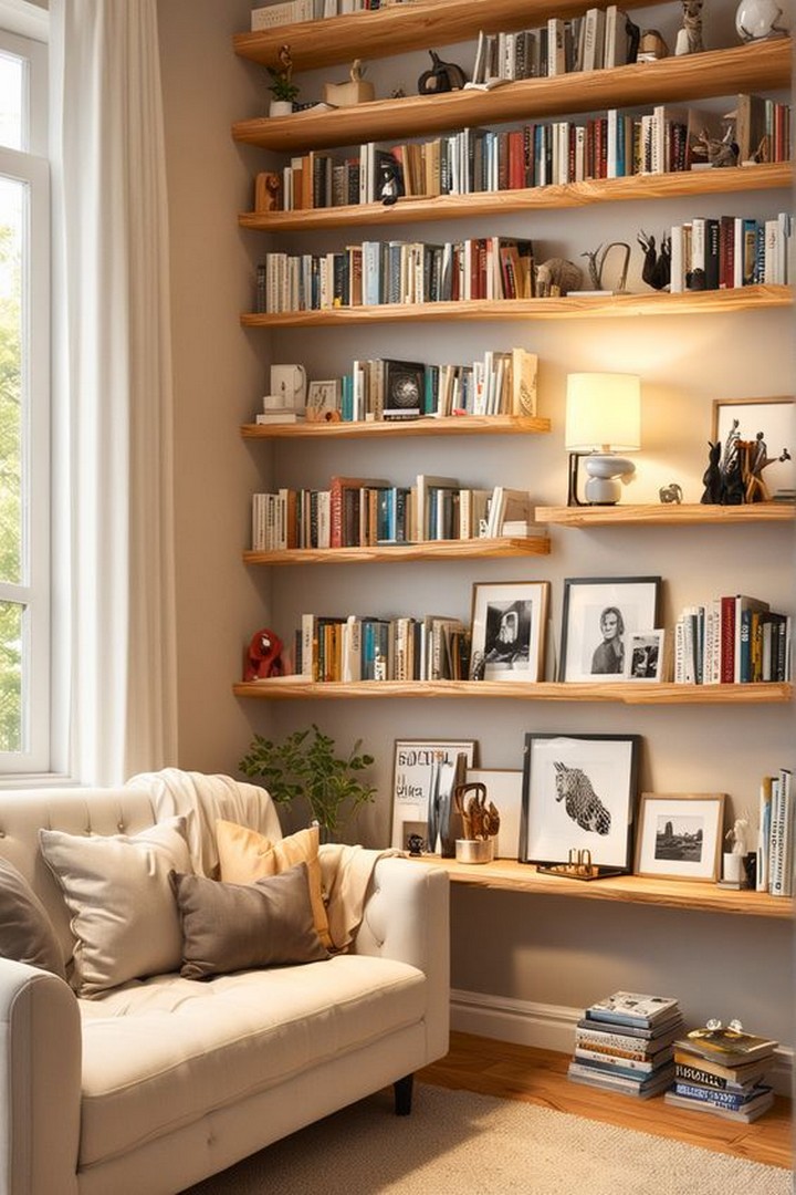 Install sleek floating shelves in a corner for a minimalist, modern look. Perfect for smaller spaces, these shelves keep the focus on your books and décor.