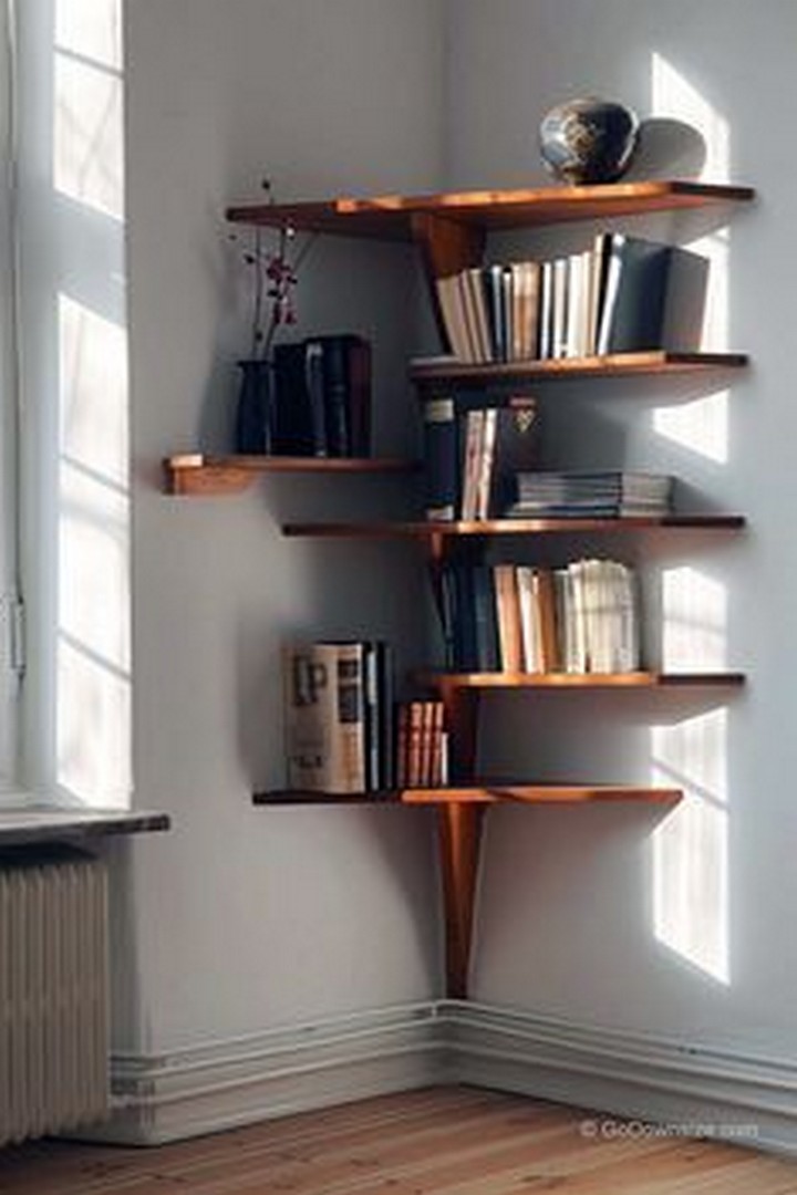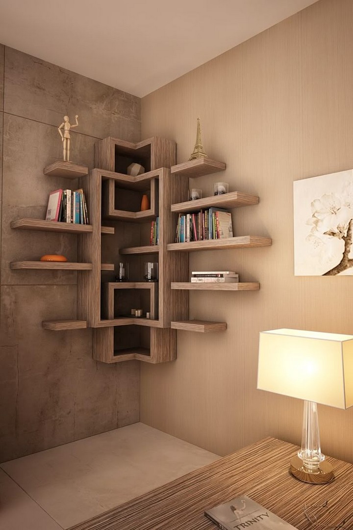 Install geometric-shaped shelves to give your corner a modern and artistic flair.
