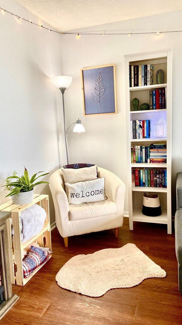 Attach wooden crates to the wall for a rustic and customizable corner bookshelf.