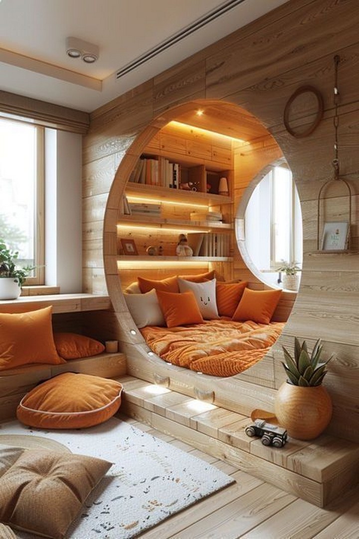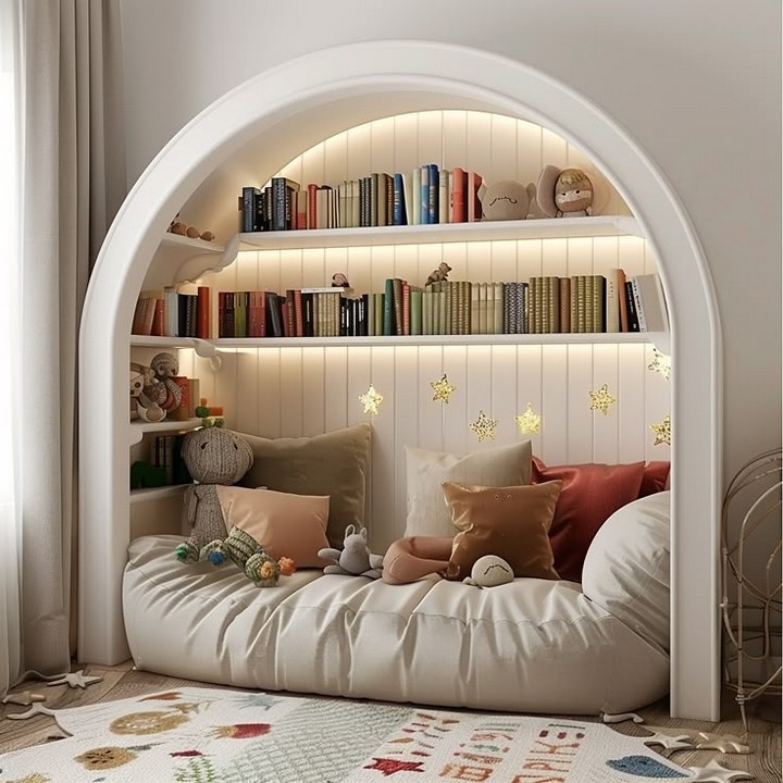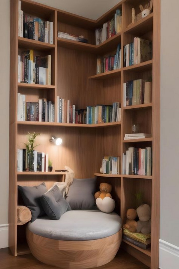 Install low corner shelves to create a cozy and accessible reading nook for children.