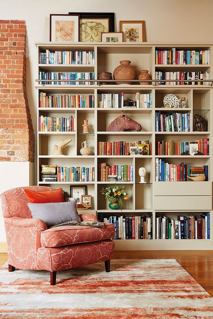 Paint the back panel of your corner shelves a bold color to make your books and décor stand out.