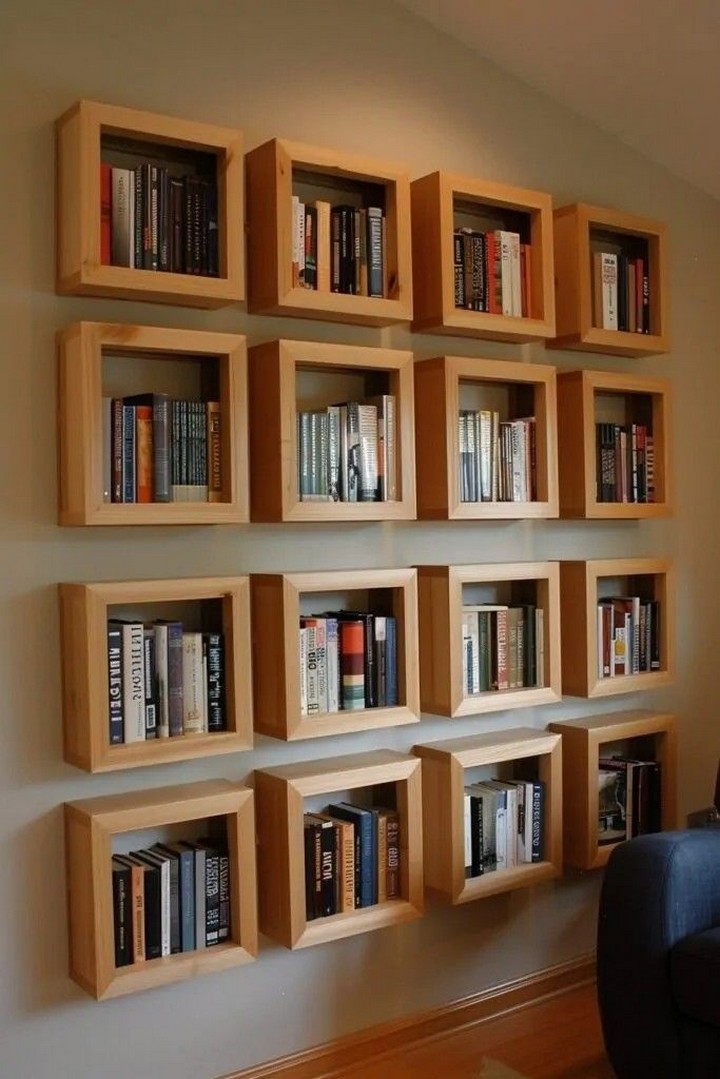 Arrange cube-shaped floating shelves in a corner to add depth and a geometric aesthetic.