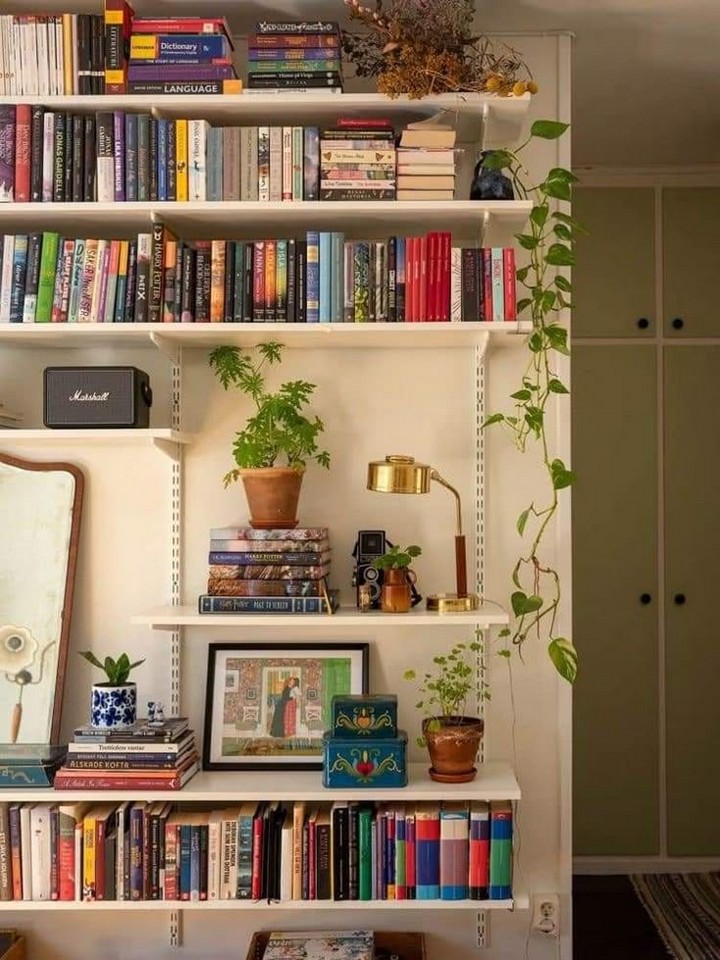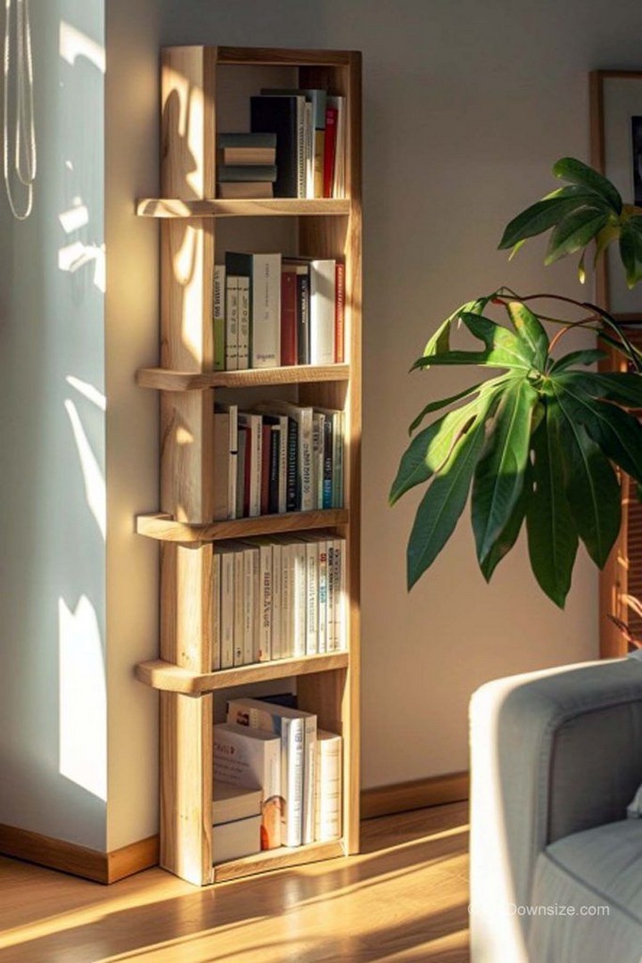 Narrow vertical shelves are ideal for small corners and can hold books, plants, and photo frames.