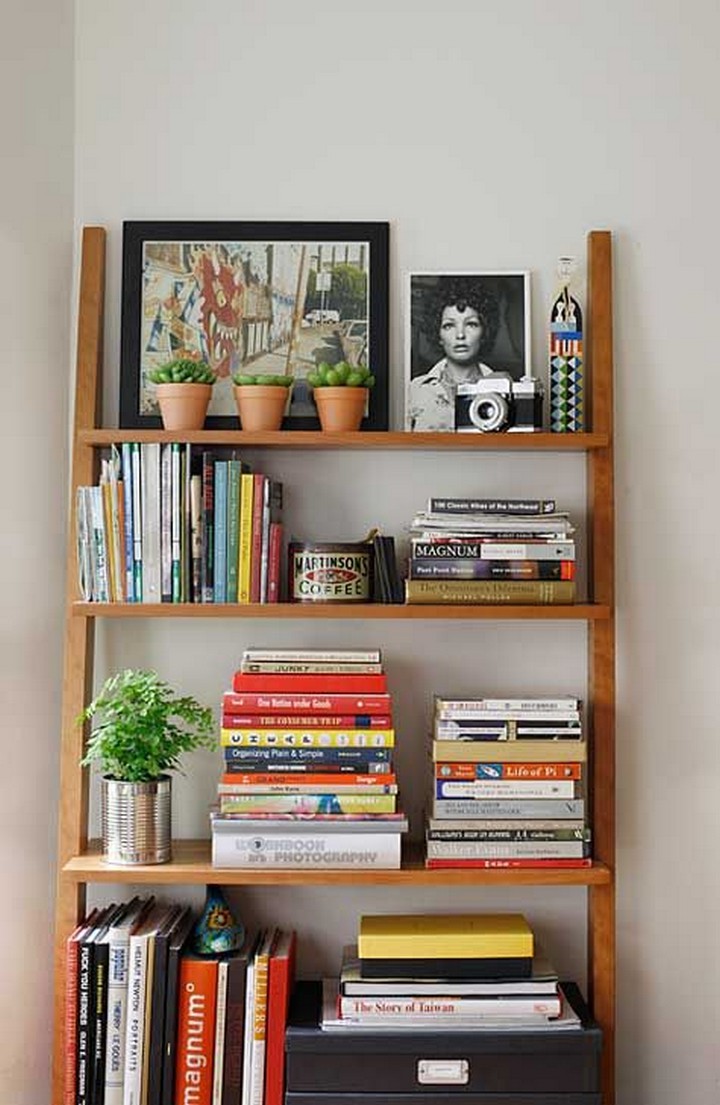 A wooden ladder repurposed as a bookshelf adds rustic charm and functionality to any corner.