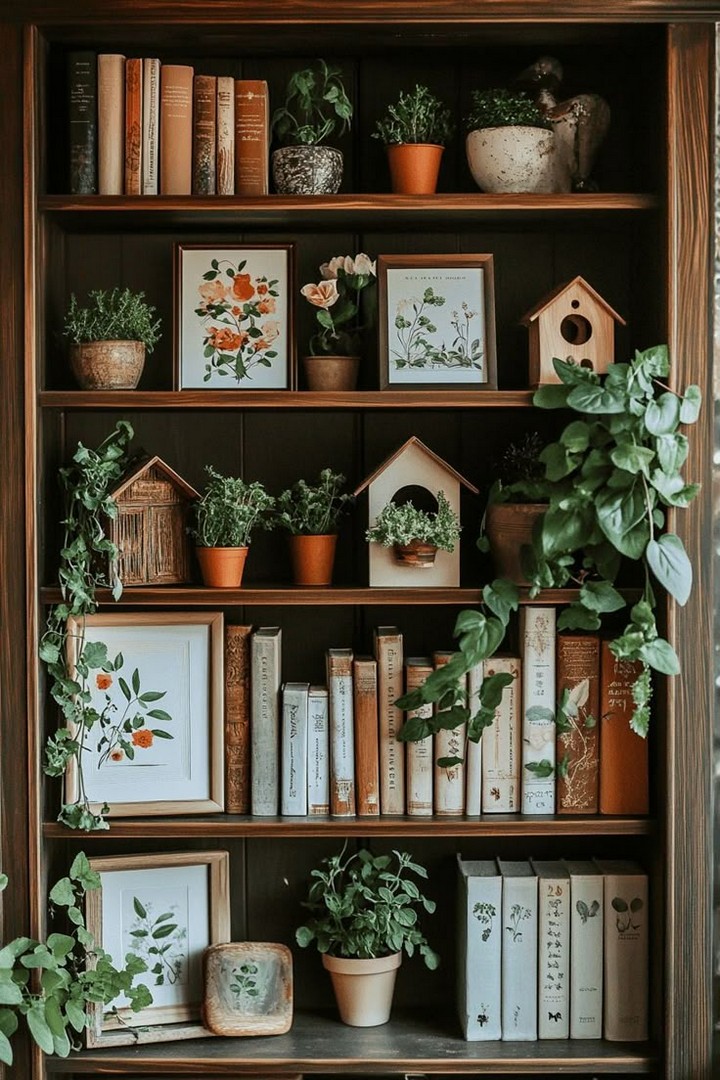 Combine bookshelves with built-in planters to add greenery and life to your corner space.