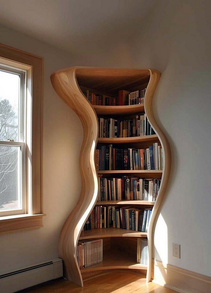A spiral bookshelf adds a playful and modern twist to your corner space, making it a true conversation starter.