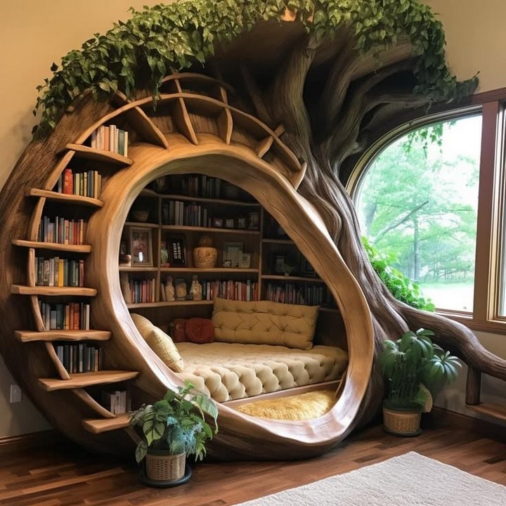 A tree-shaped bookshelf creates a unique and artistic way to display your books and ornaments.